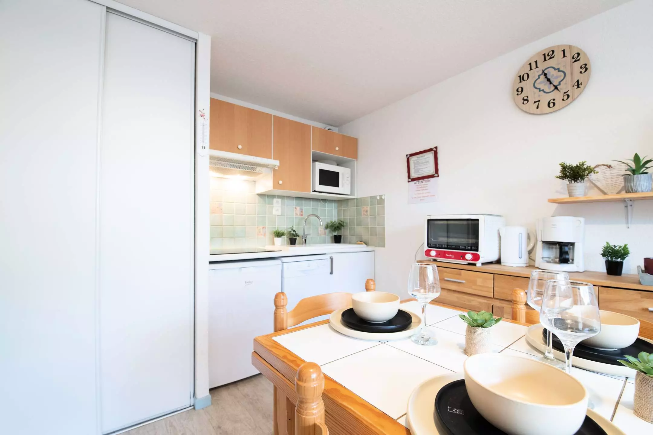 A kitchenette open to the living room (with mini-oven and microwave, 1 vitro hob (3 burners), dishwasher)