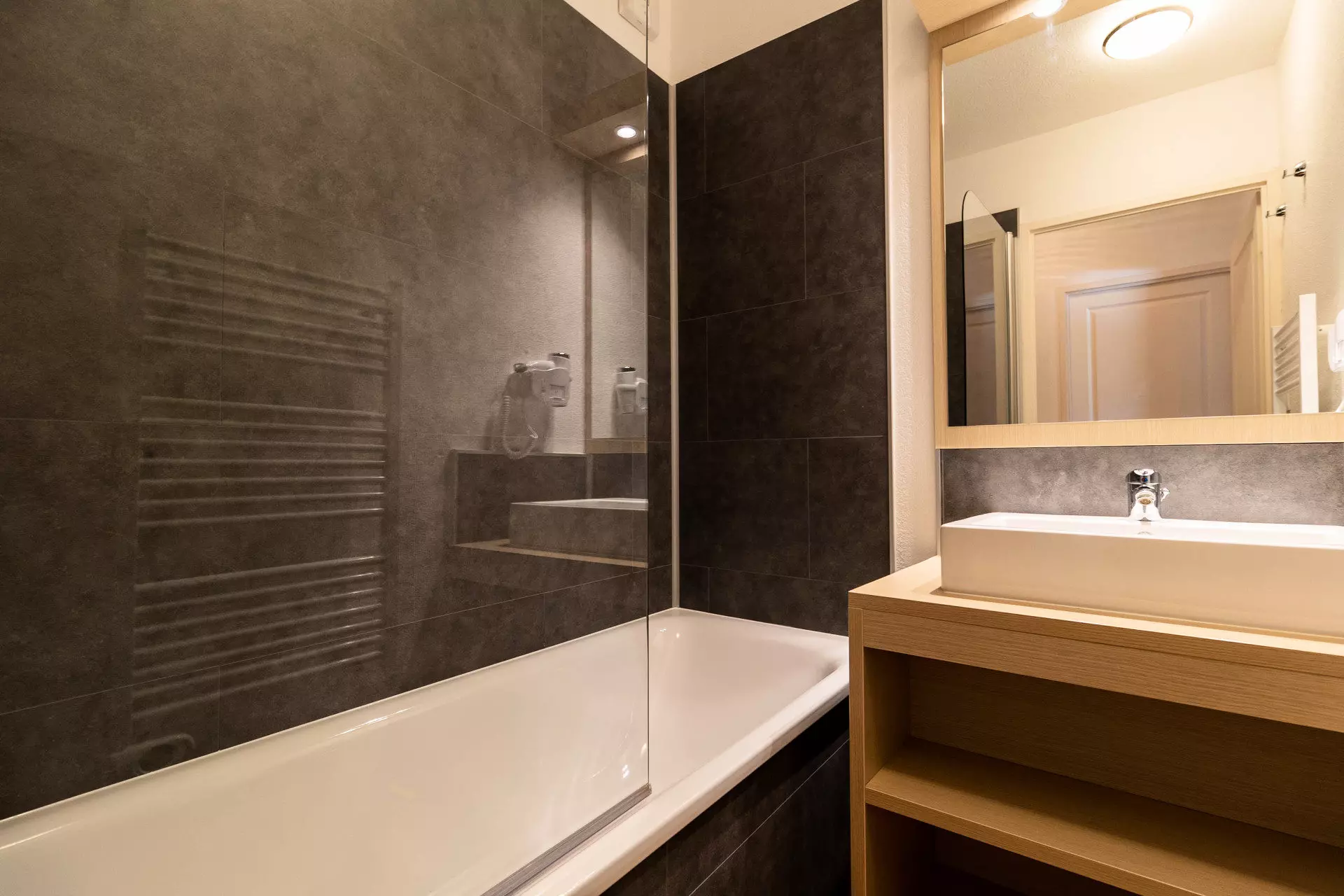 The bathroom has a bathtub for a moment of relaxation.