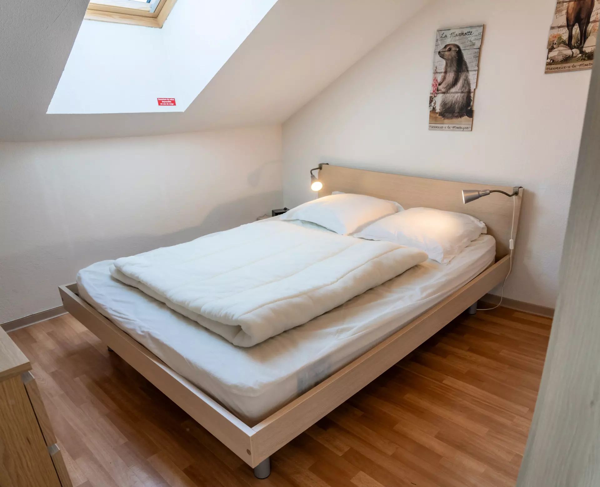 The living area consists of a living room with a sofa that converts into a double bed and a fully equipped kitchen (dishwasher, microwave grill, coffee machine, kettle, toaster, raclette machine, etc.). The dining table can accommodate up to 6 guests to share moments of conviviality with the family.