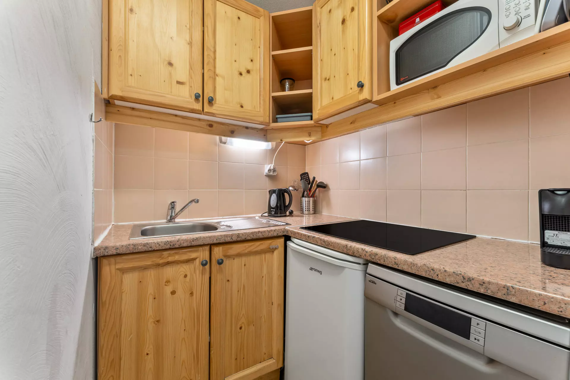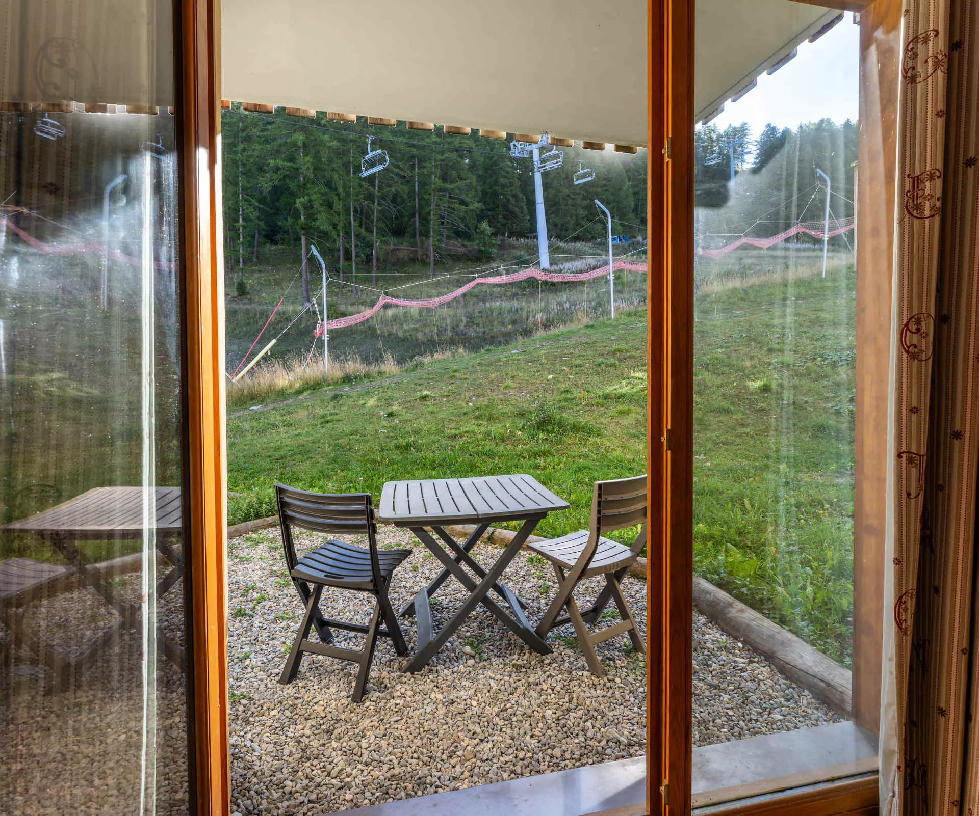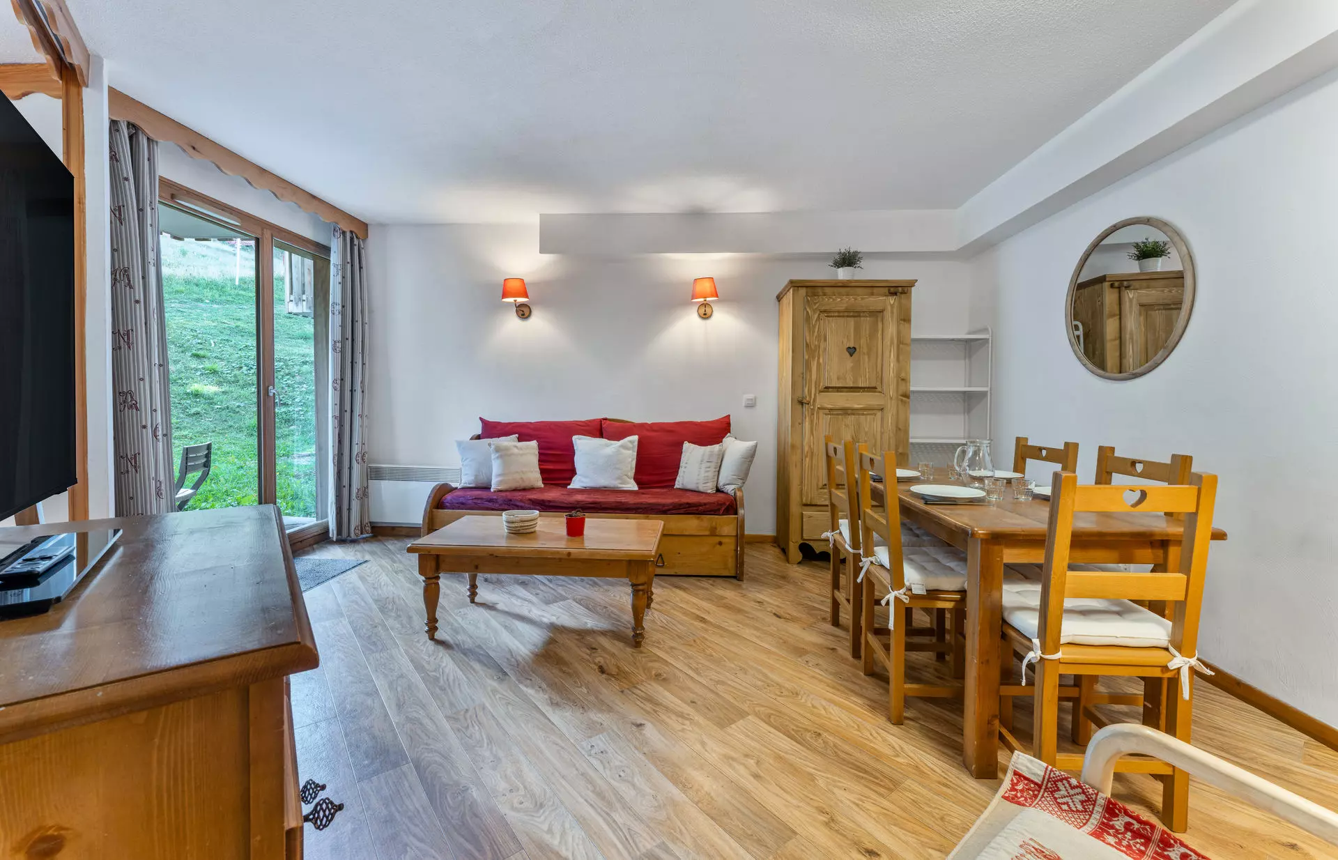 Decorated in a mountain style, the apartment consists of a large living room with a 2-seater pull-out sofa bed and television. From this room, you access the terrace and its garden furniture, for breakfasts, in the sun and aperitifs with friends.