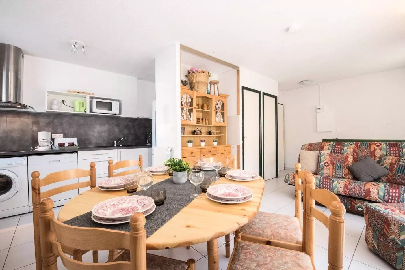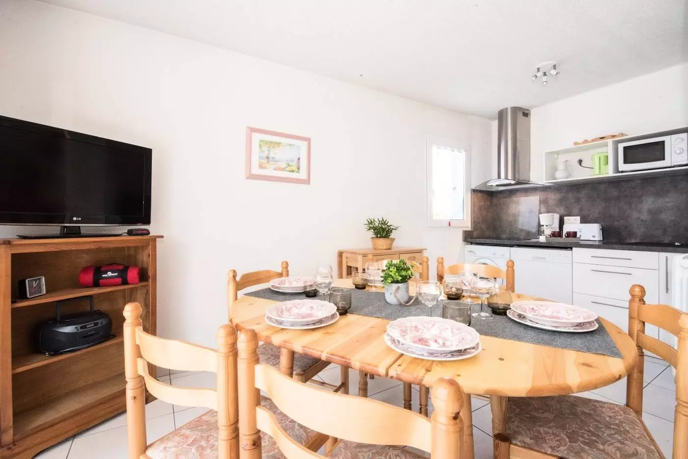 a fully equipped kitchen open to the living room with its dining room table that can comfortably accommodate 6 guests.