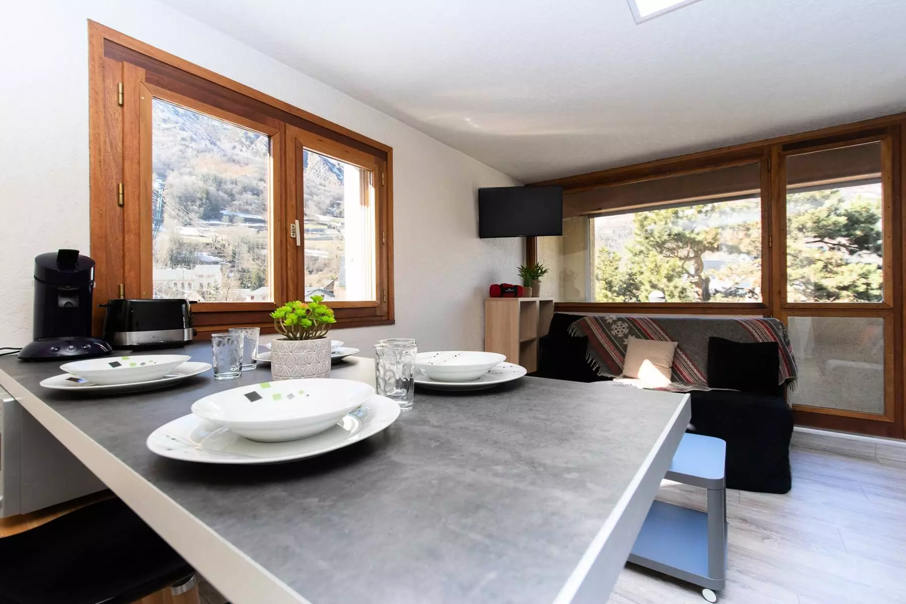 The main room consists of an equipped kitchenette, a living room with a double sofa bed, and a television.