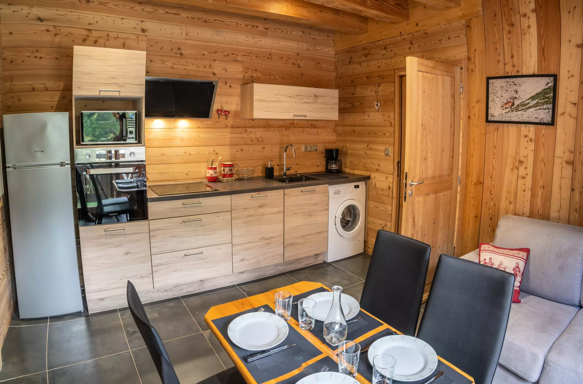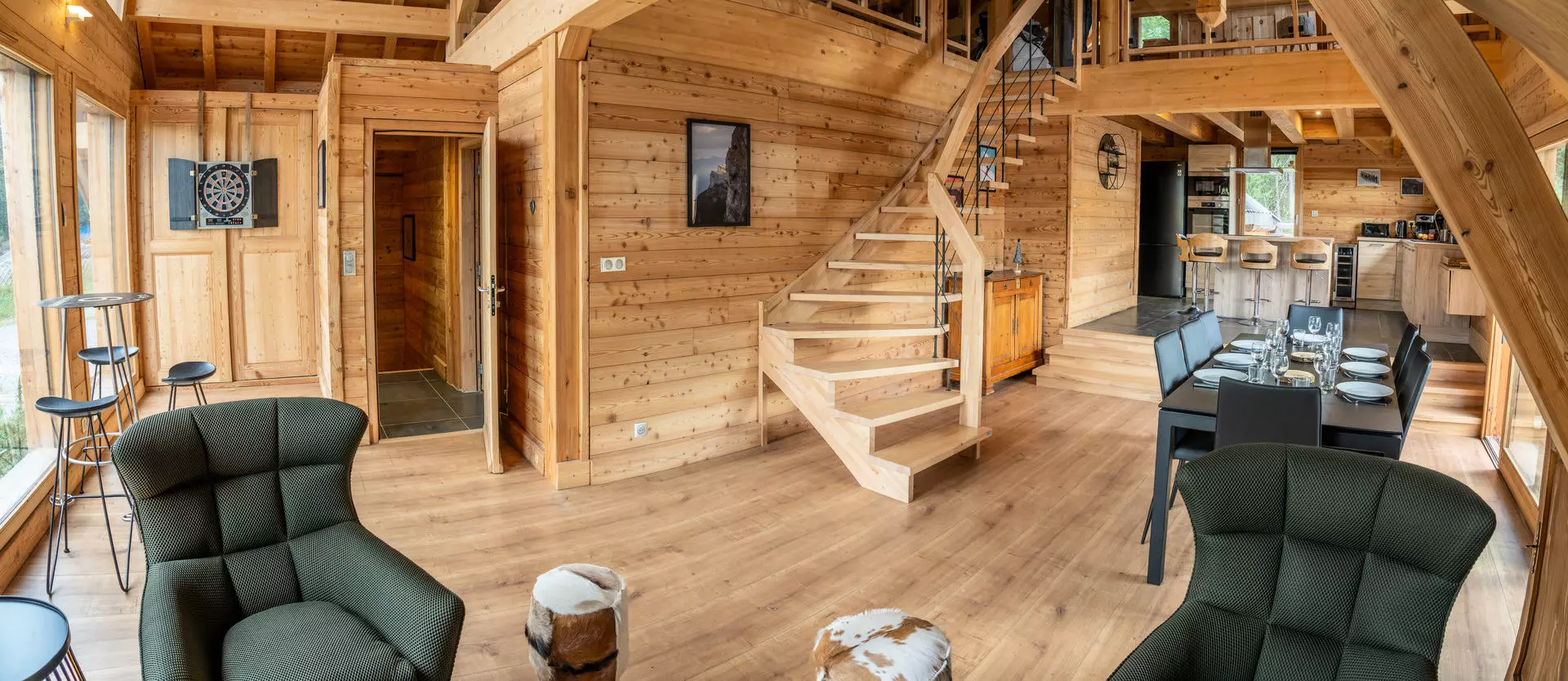 You will appreciate the generous volumes of the central room which consists of a fully connected lounge area (television, fiber WIFI connection, Bluetooth speaker) and an open and raised kitchen, perfectly equipped (dishwasher, wine cellar, oven, mixed coffee maker, microwave, kettle, toaster). The dining room is designed to share unforgettable moments with those you love and can accommodate up to 15 guests at the table. The large openings to the outside let in the sunshine of the Southern Alps and the natural light enhances the interior decor. Once night falls, the interior framework lights up thanks to the numerous LEDs to create a subdued and comforting atmosphere.