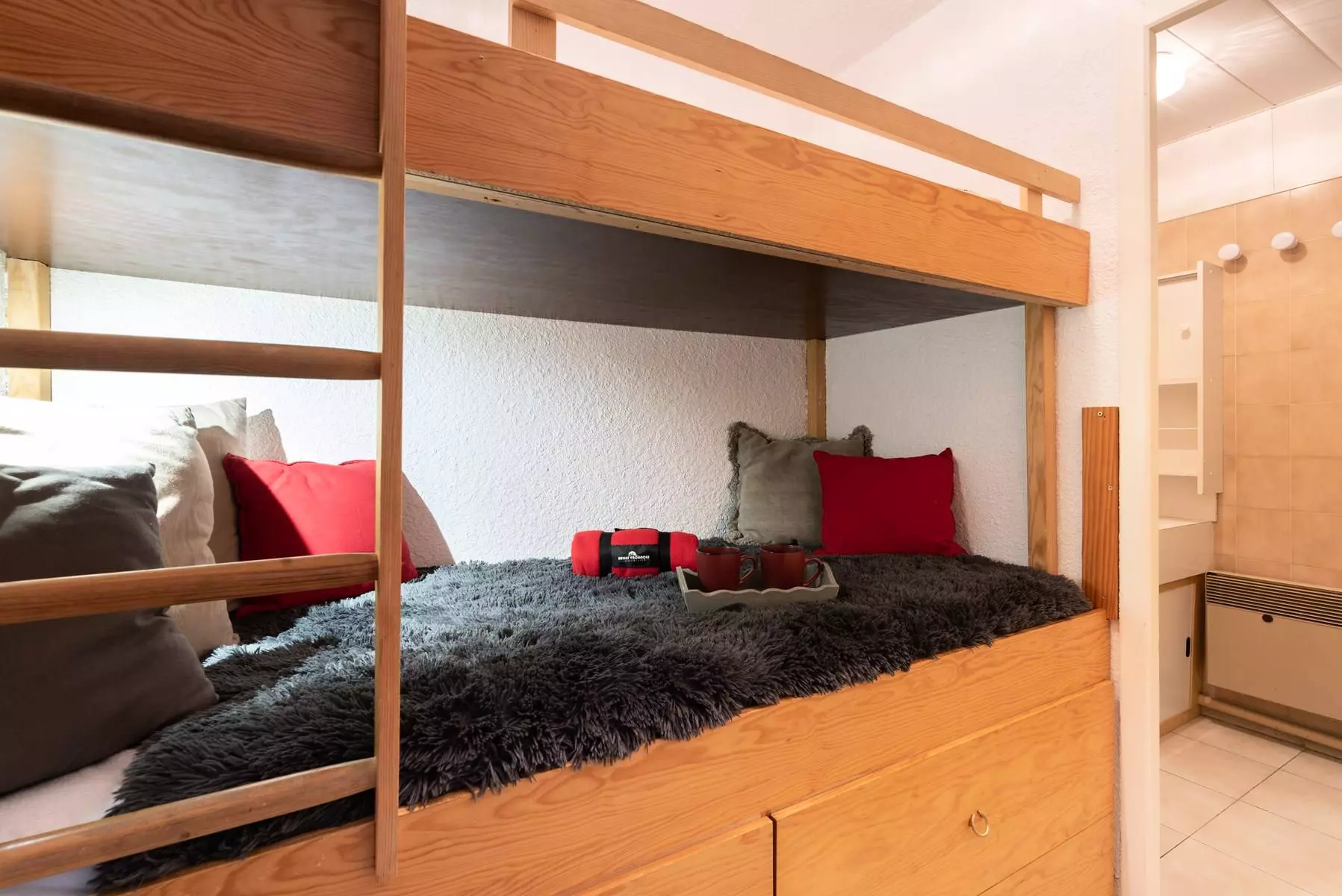 A sleeping area with 2 single bunk beds