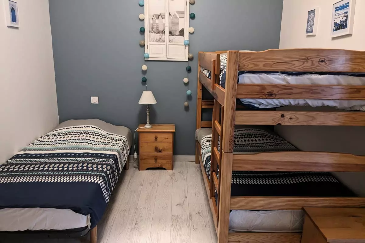 - two bedrooms with a double bed, a single bed and a bunk bed;