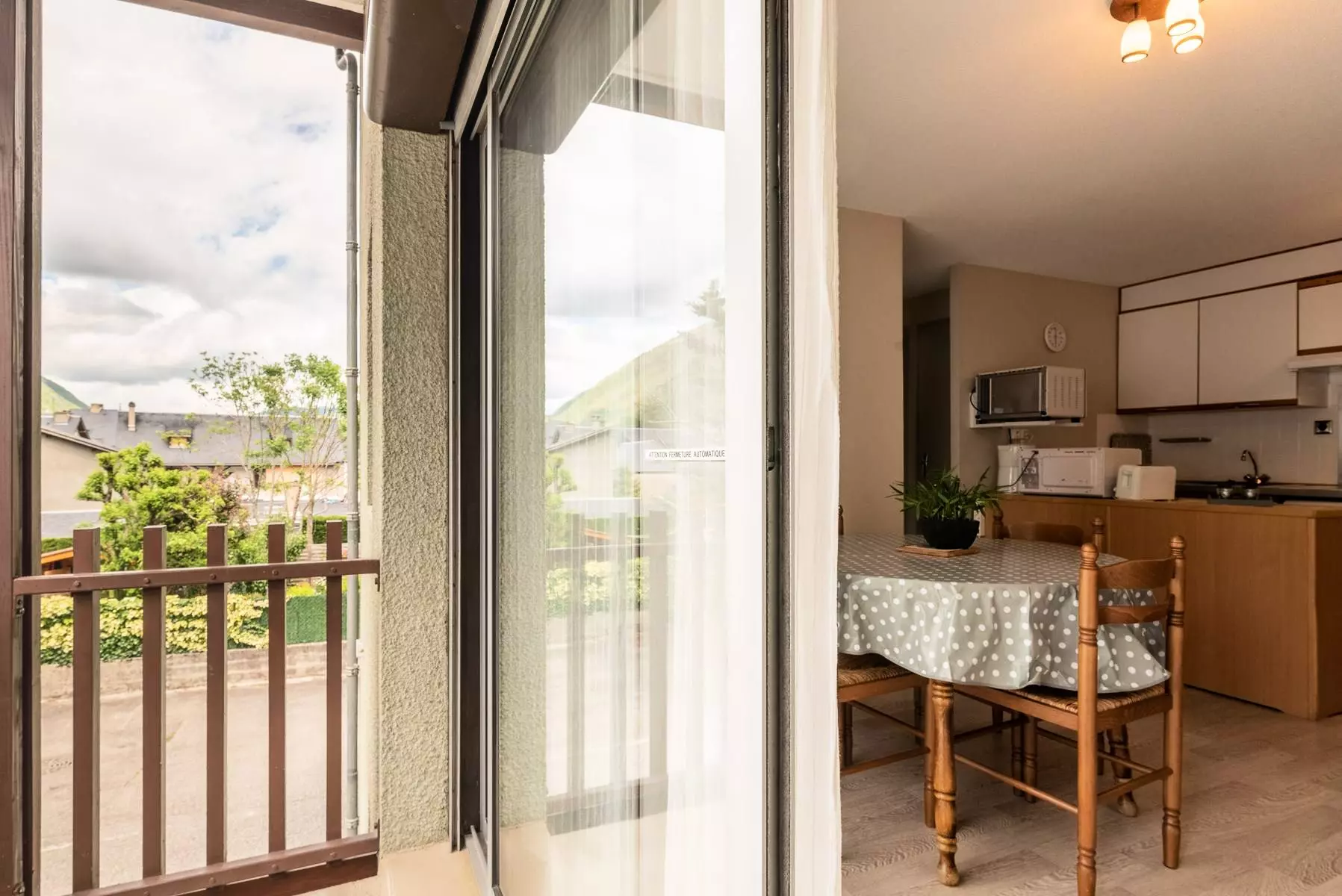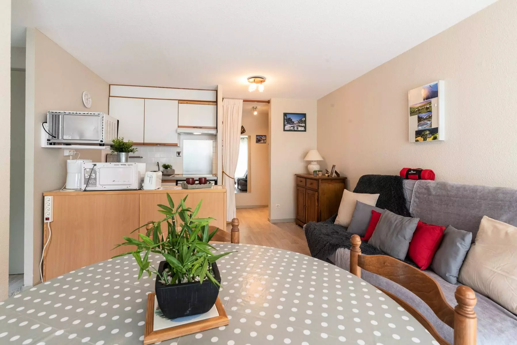 The kitchenette is equipped with a mini oven, microwave, ceramic hob (3 burners), dishwasher.