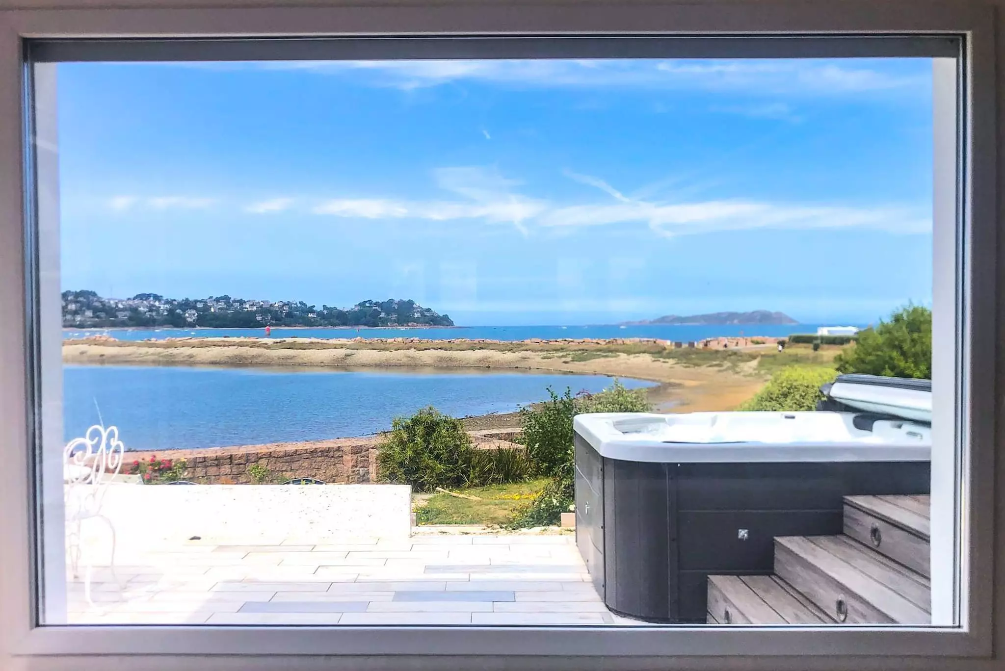 PERROS GUIREC, rental of an exceptional house for 6 people with spa and sauna. The privileged setting of this waterfront villa with its private and secure access to the Lenn, its breathtaking and panoramic 180° sea view over the bay of Perros-Guirec. The hiking trail along the estate will allow you to discover on foot, the nearby beaches as well as the picturesque landscapes of Granite Rose, the Port of Perros-Guirec and its local shops. Recharge your batteries in