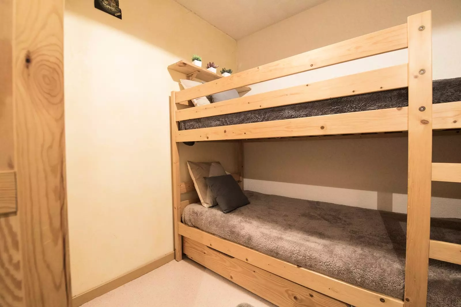 It consists of a cabin with 2 bunk beds at the entrance and a living room/kitchenette for the main room.