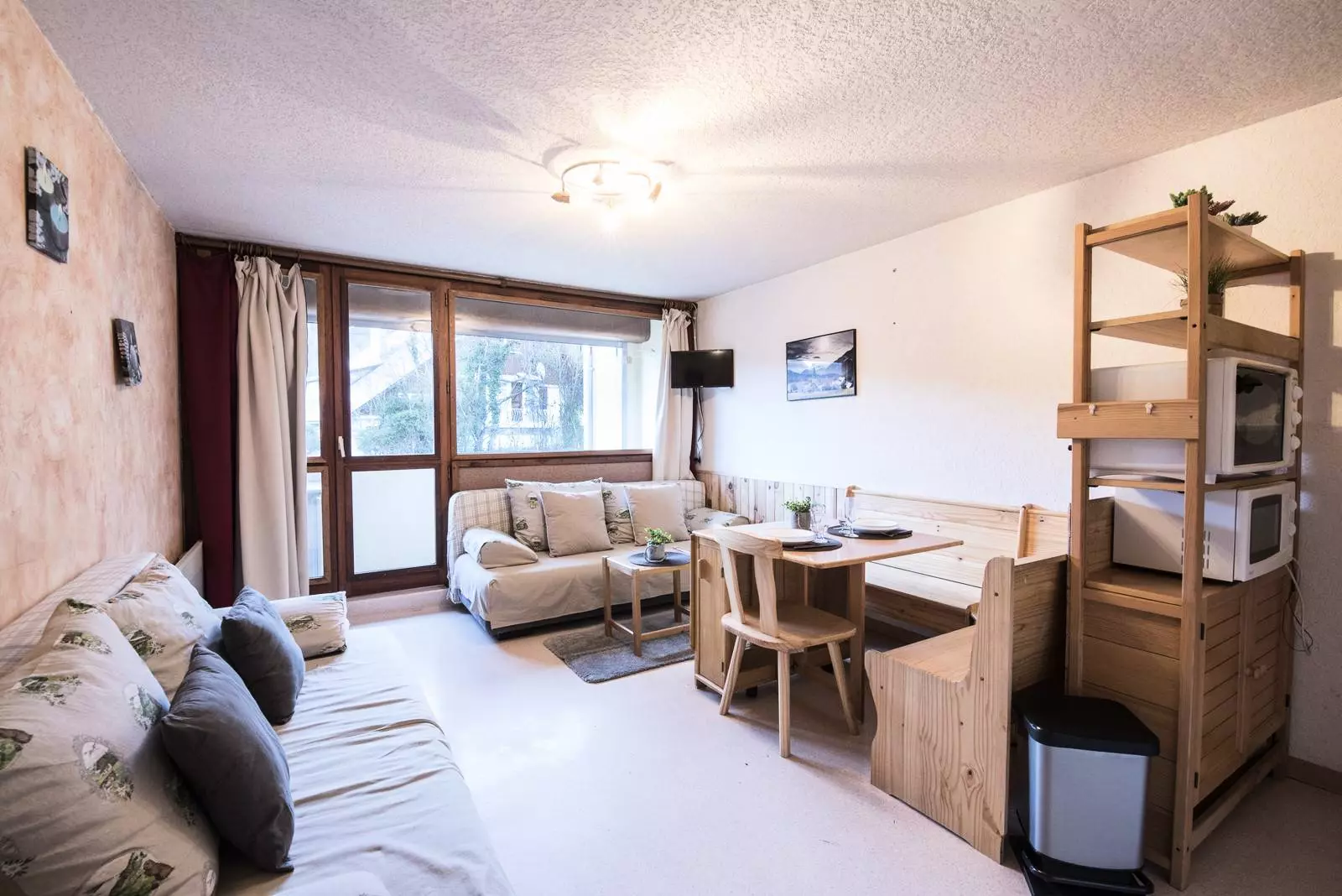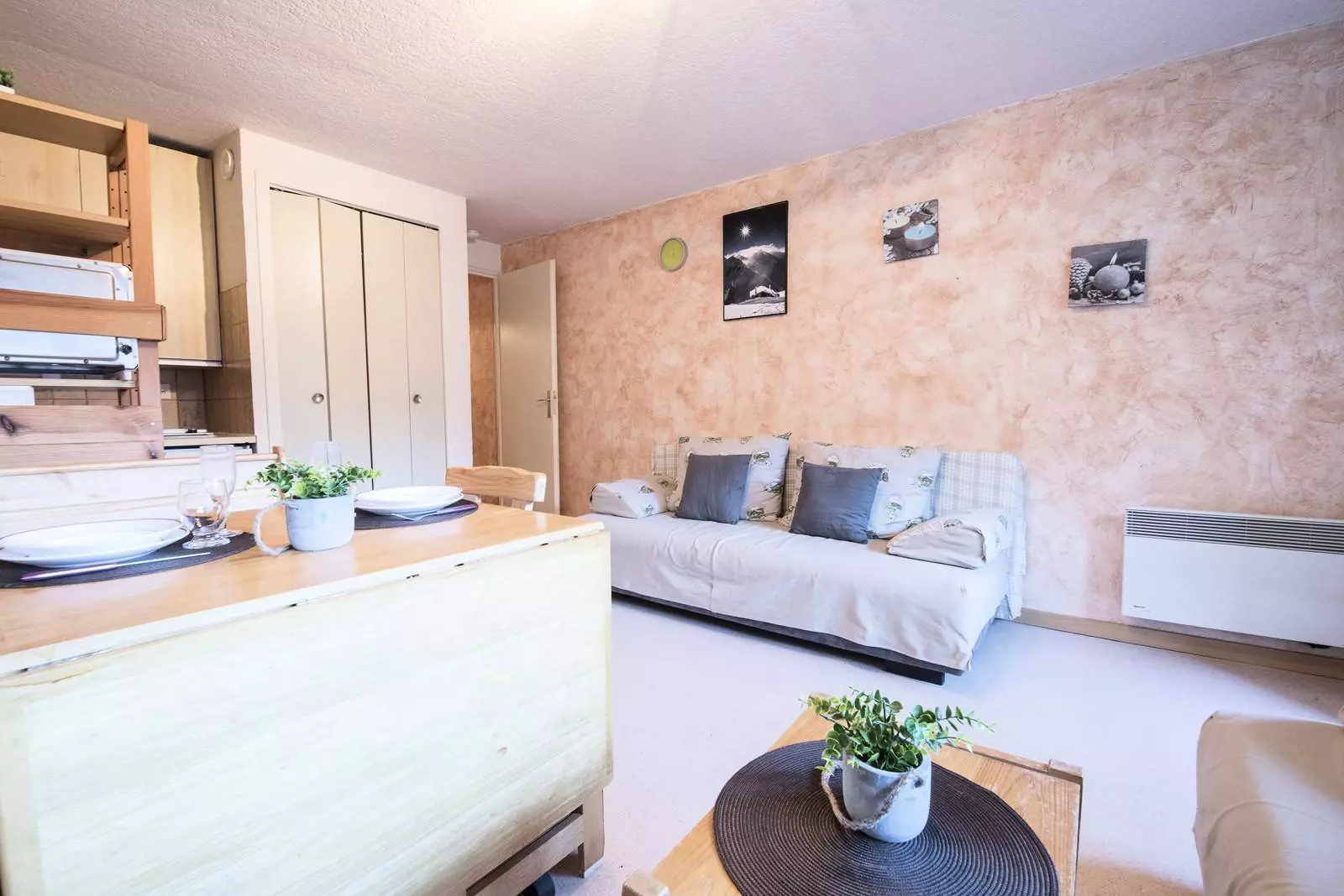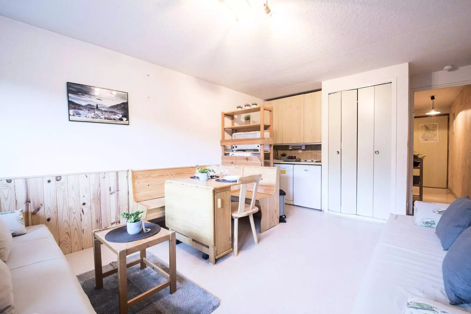 You have a 160cm sofa bed for 2 people and the kitchenette is equipped.
