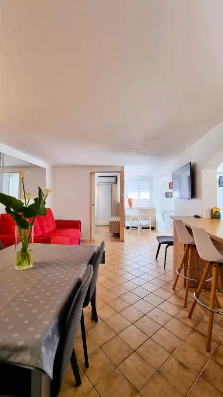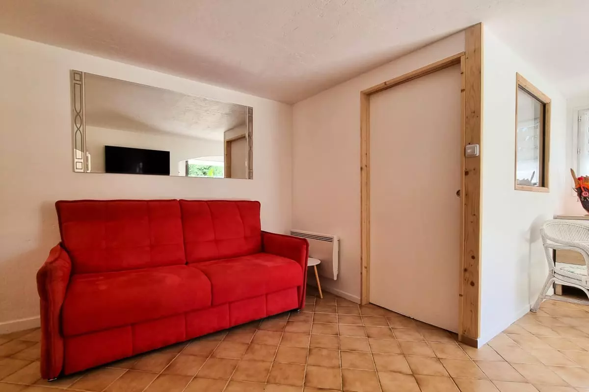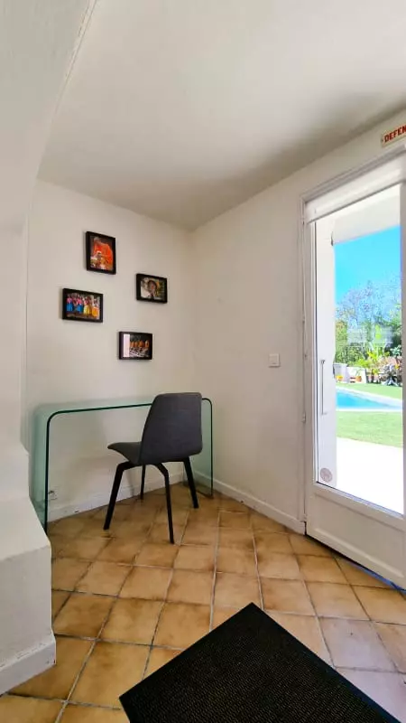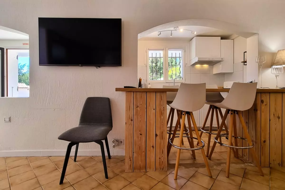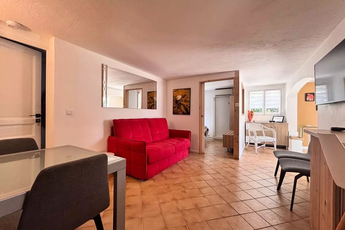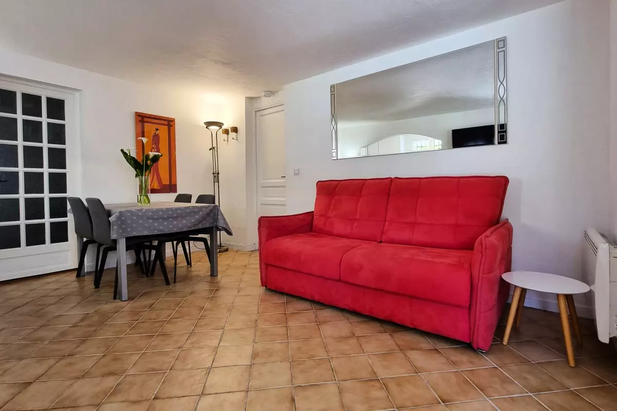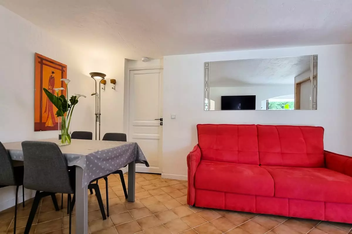 - 1 Living room with sofa, dining table, television opening onto the terrace facing the swimming pool.