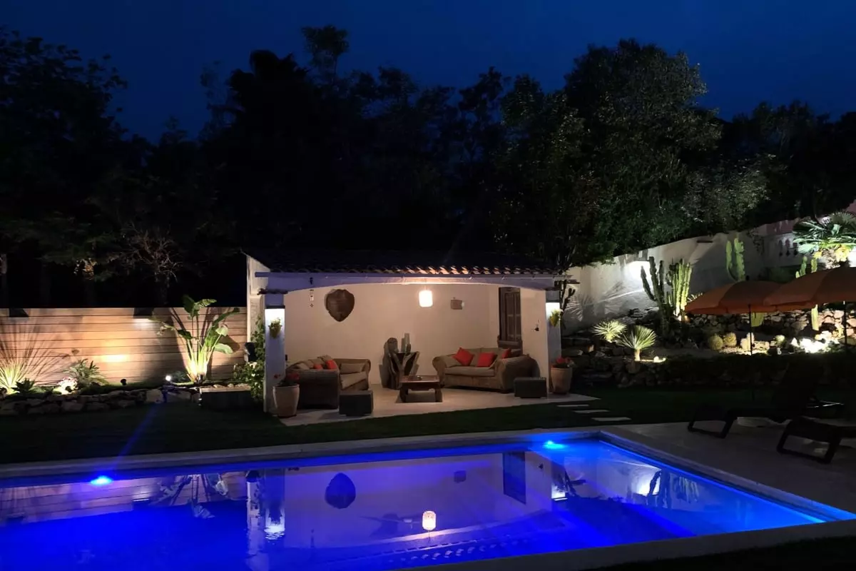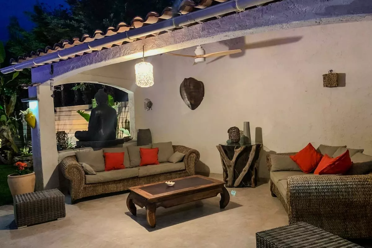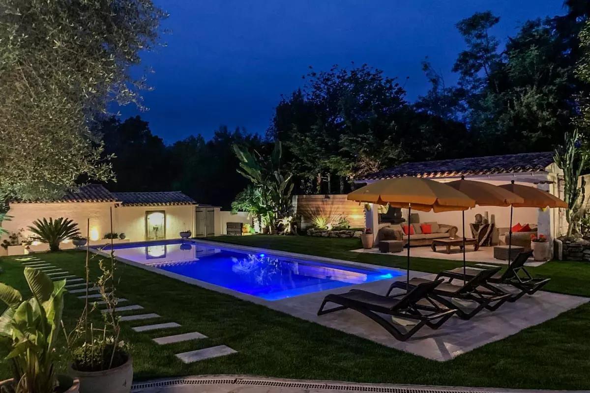 A pool house equipped with garden furniture, deckchairs, a pétanque court, and a ping-pong table.