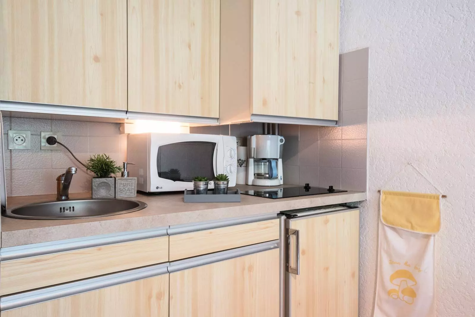 Finally, the kitchen area equipped with mini-oven and microwave opens onto the living room.