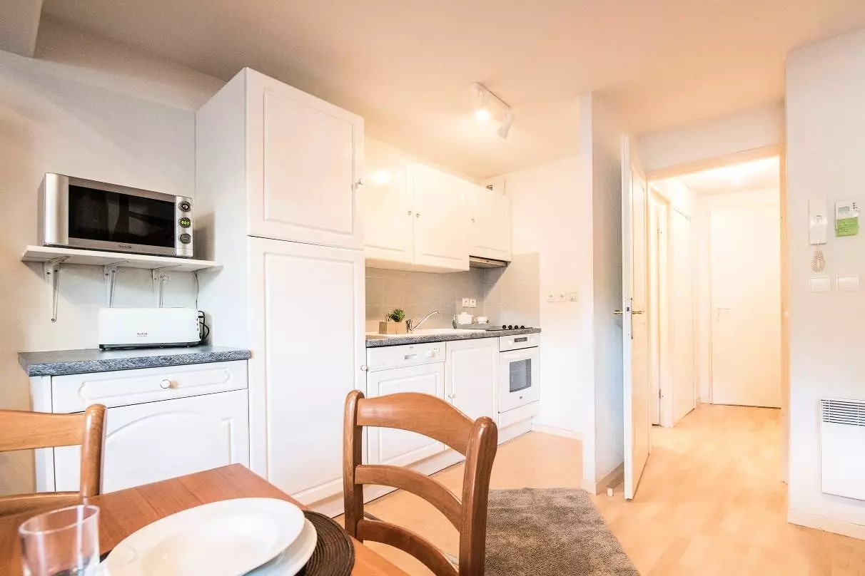 A fully equipped kitchenette open to the living room (ceramic hob + microwave/grill + dishwasher)