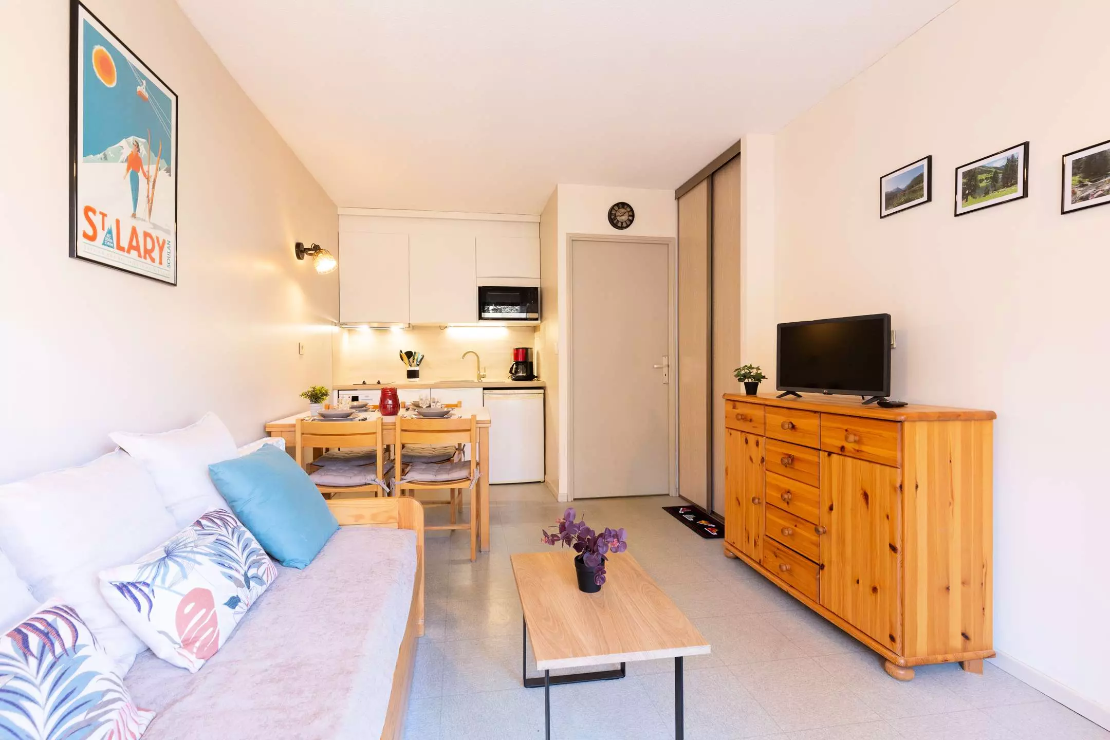 An open living room with TV and pull-out sofa that can accommodate 3 people.
