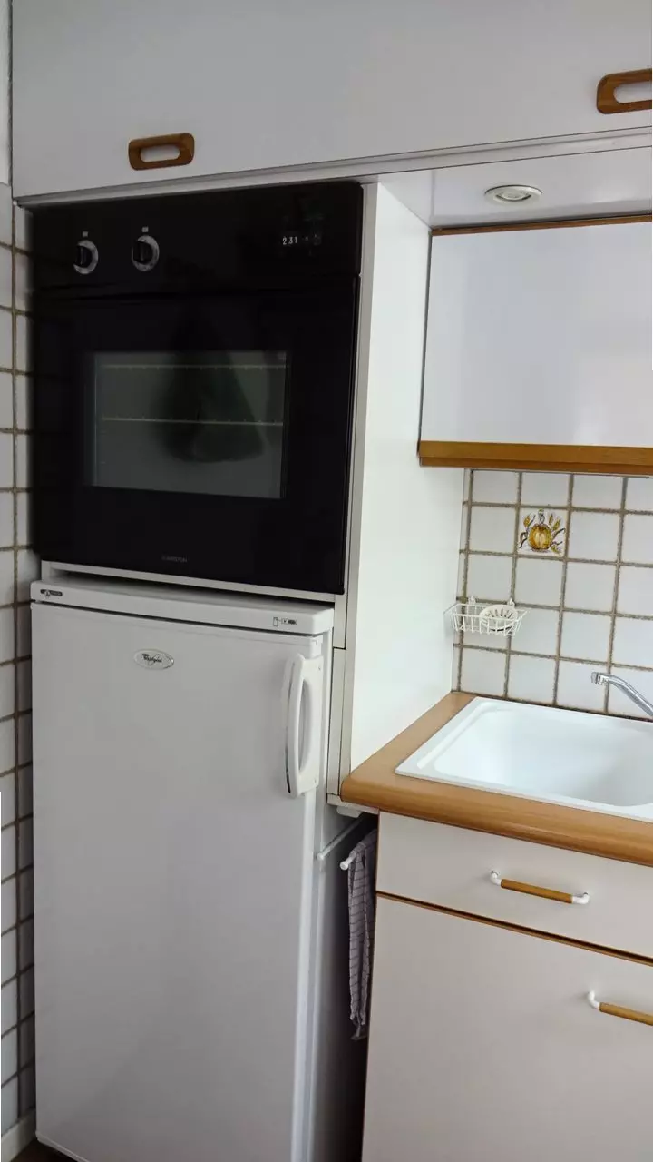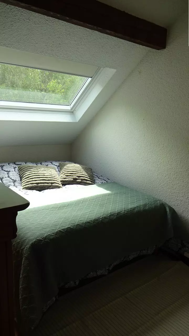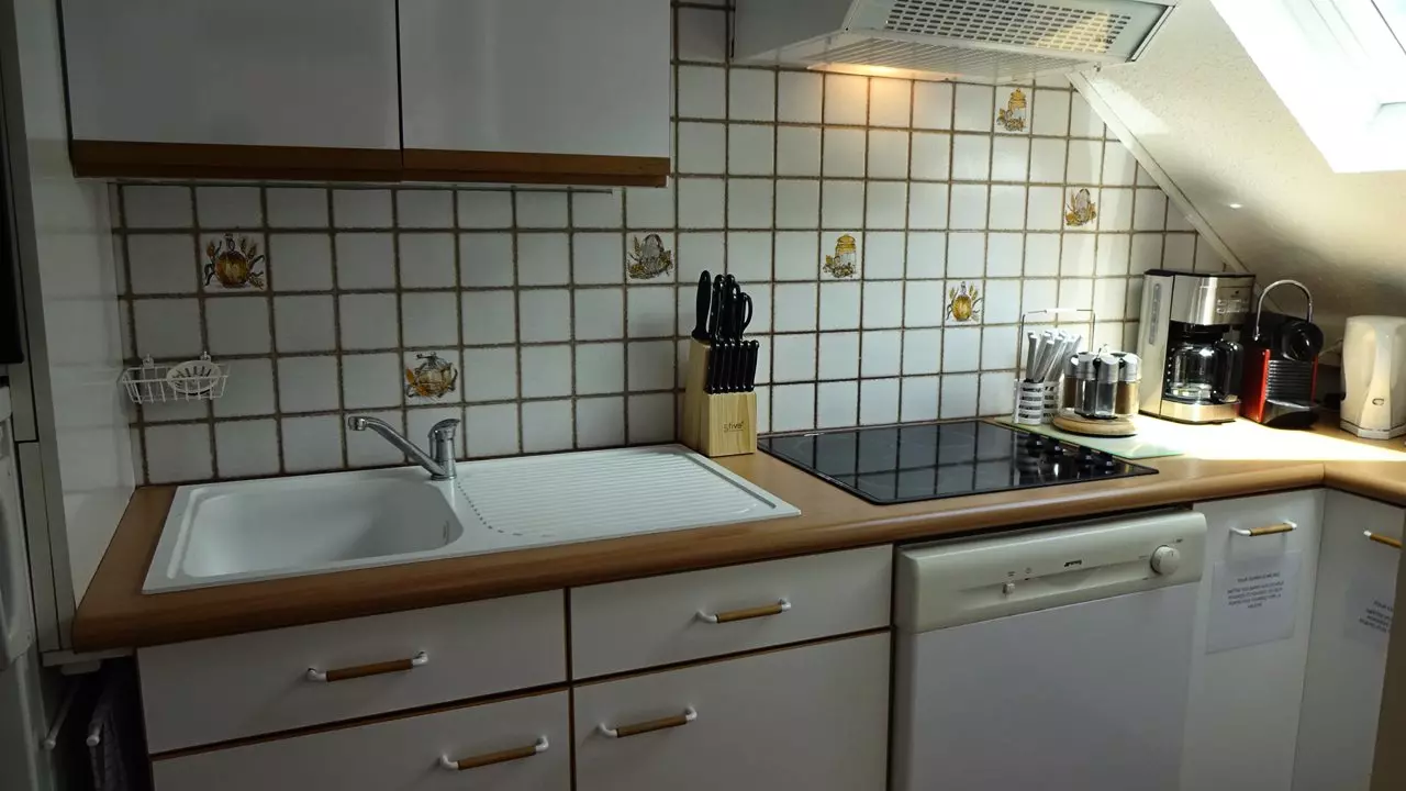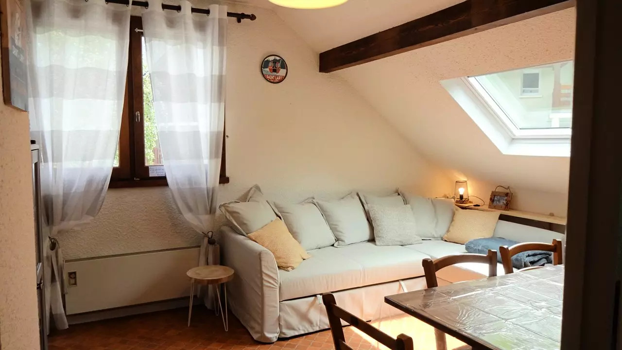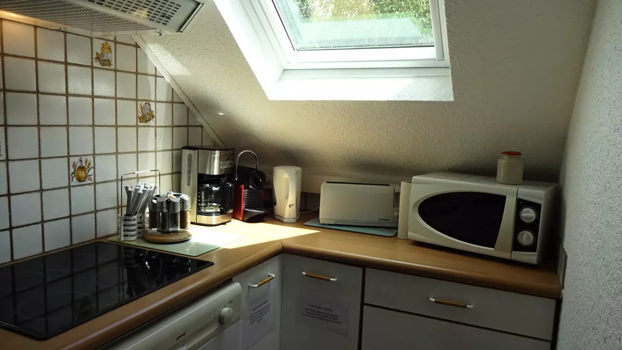 The main room facing South East consists of a bright living room with a sofa bed and dining area, a separate kitchen equipped with a dishwasher, fridge, induction hob and oven and a microwave opening onto the outside with a VELUX window.