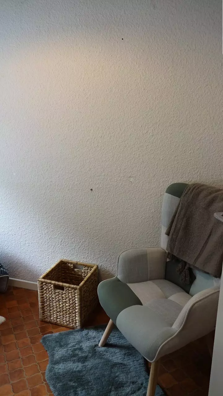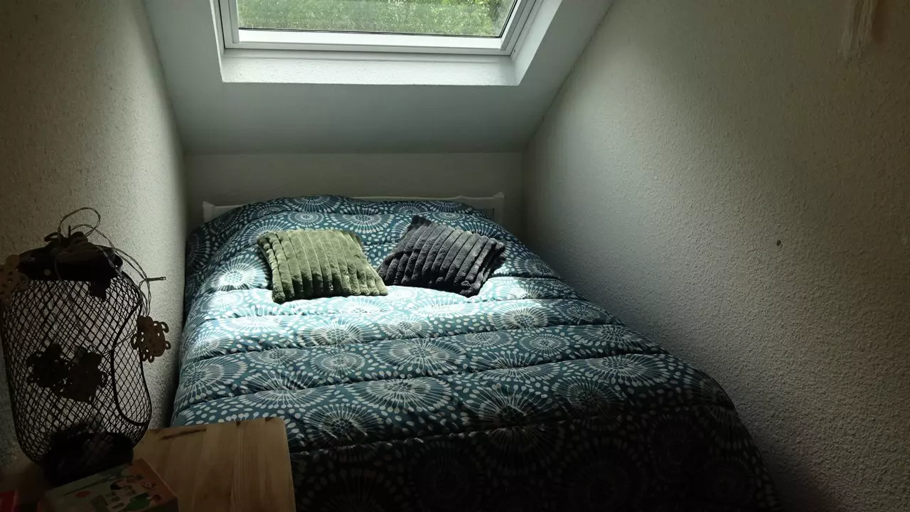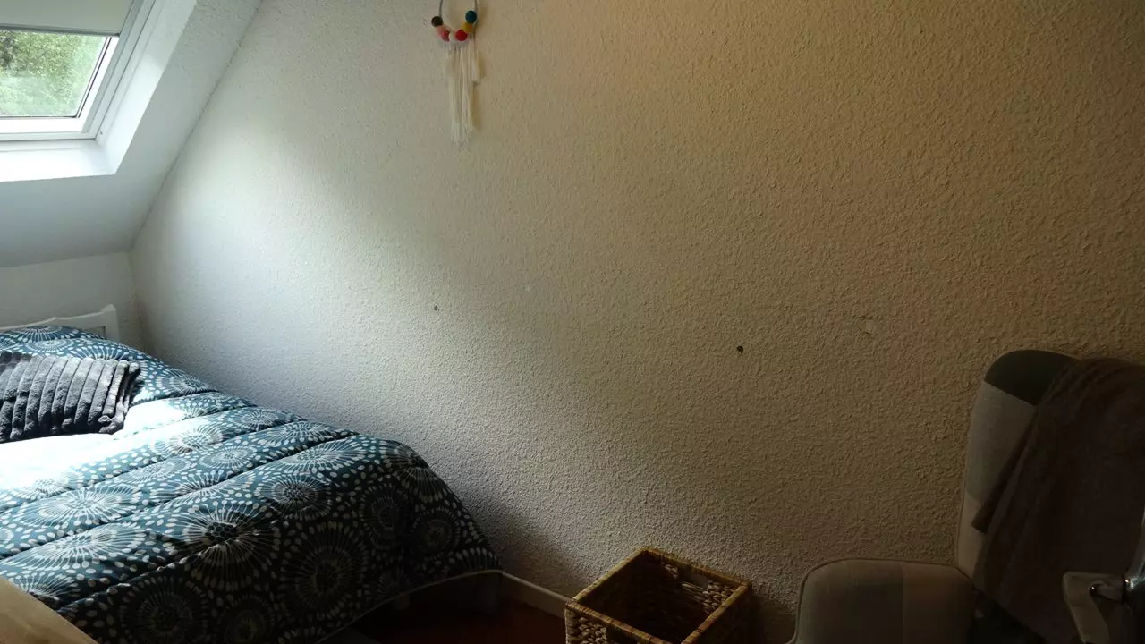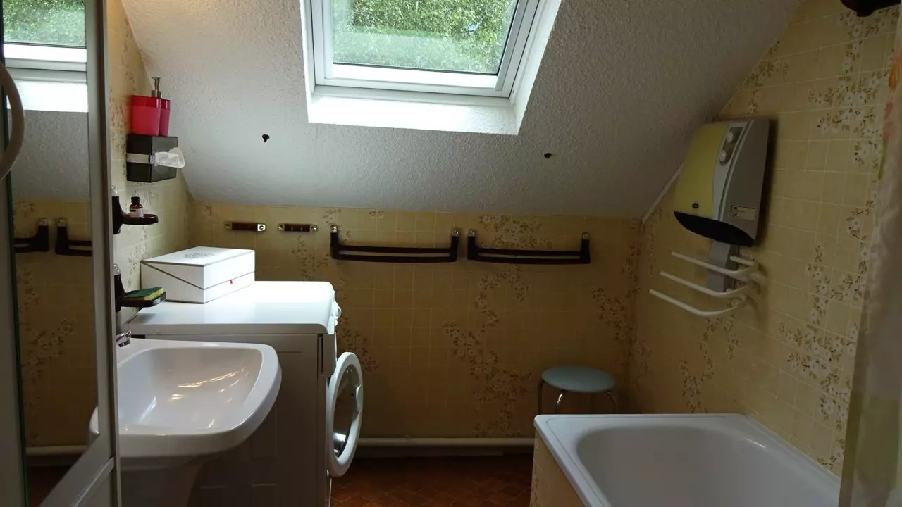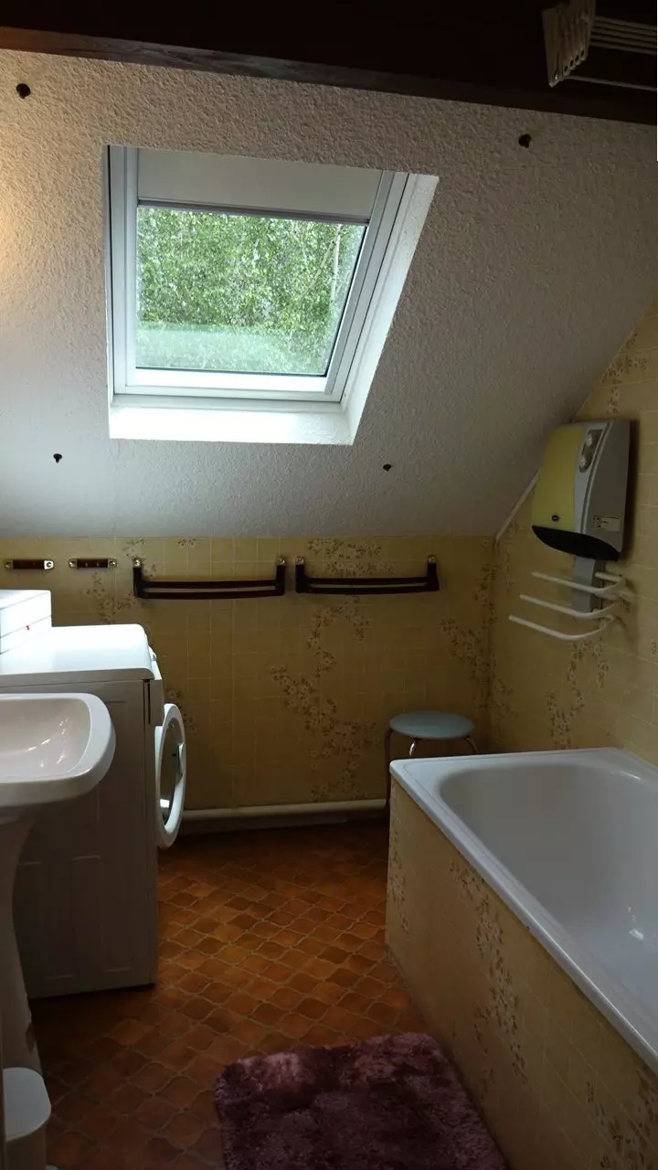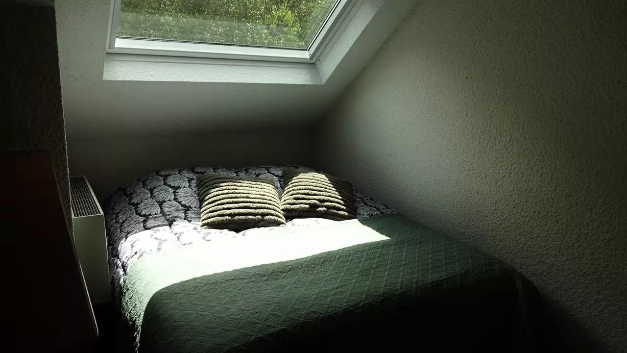The main room facing South East consists of a bright living room with a sofa bed and dining area, a separate kitchen equipped with a dishwasher, fridge, induction hob and oven and a microwave opening onto the outside with a VELUX window.