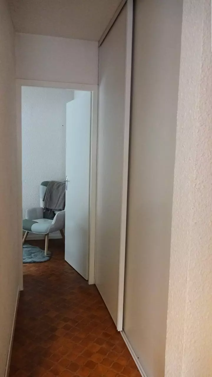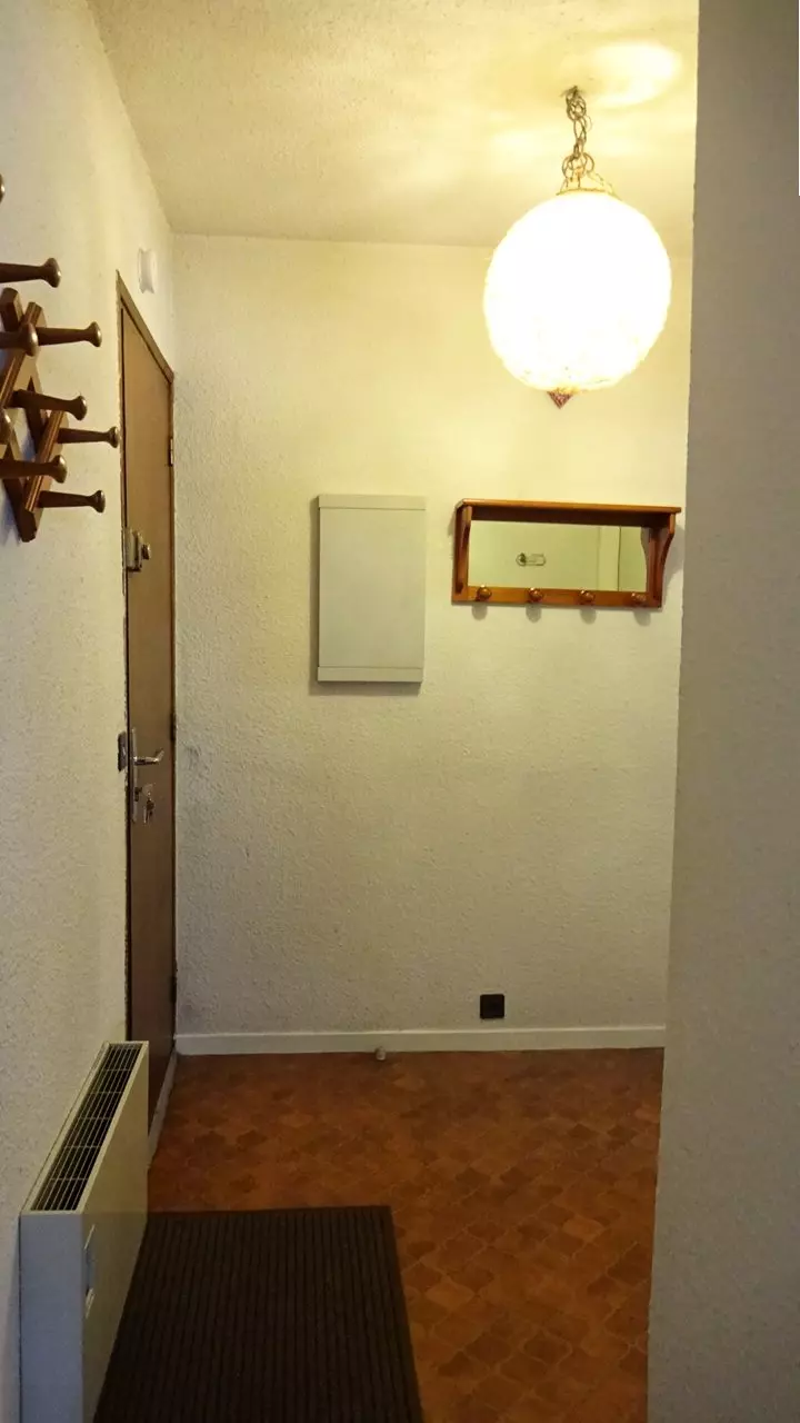 A bedroom with a 140 cm bed and a storage unit facing west and a second bedroom facing west with a 140 cm bed. A hallway with a large storage cupboard. A bathroom with a washing machine opening with a VELUX window and a separate toilet. Parking space, a ski locker.