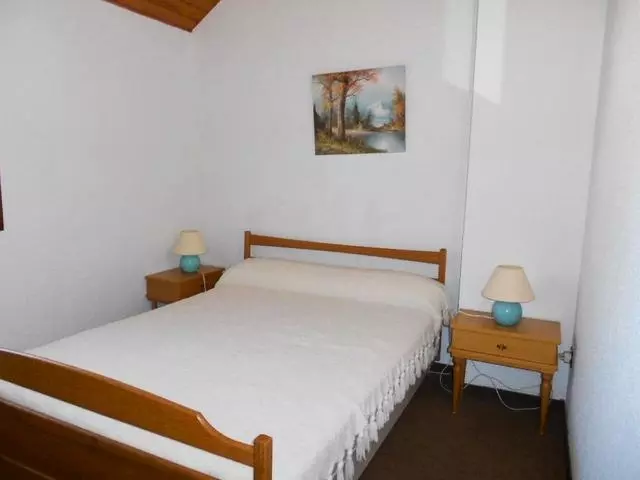 On the 1st floor without elevator, of a small residence in the thermal baths district, apartment for 6 people in duplex with a living room with a sofa bed for 2 people, a TV, kitchenette equipped with LV, opening onto a south-facing balcony. Bathroom and separate toilet, gerflex floor. Upstairs, 1 attic bedroom with 1 bed in 140 and skylight. An attic bedroom with 1 bed in 120, 2 bunk beds and skylight. Carpeted floor. Traditional pine furniture. Approx. 40 M2. Living room 15 M2 approx. Parking space and ski locker.