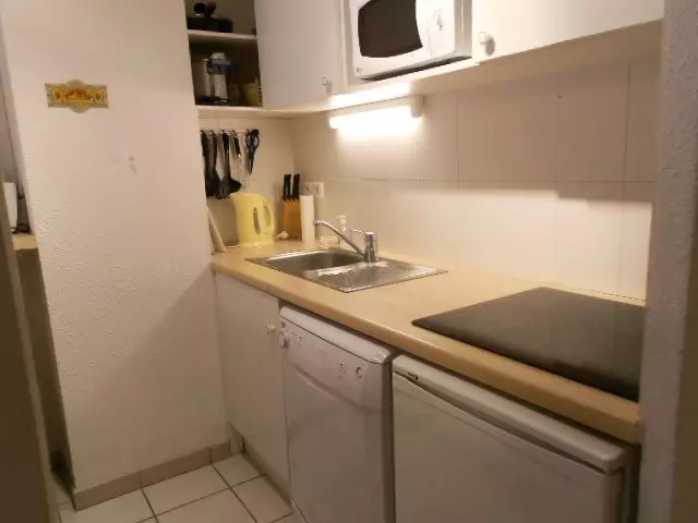Living room with sofa bed opening onto a 10m2 south-facing garden. Equipped kitchenette (4 ceramic hobs, top fridge, dishwasher, washing machine, microwave, mini-oven, upper and lower storage cupboards). Upstairs, a bedroom with a 140cm bed, a bedroom with 2 90cm beds. Bathroom. Tiled floor and carpet in the bedrooms.