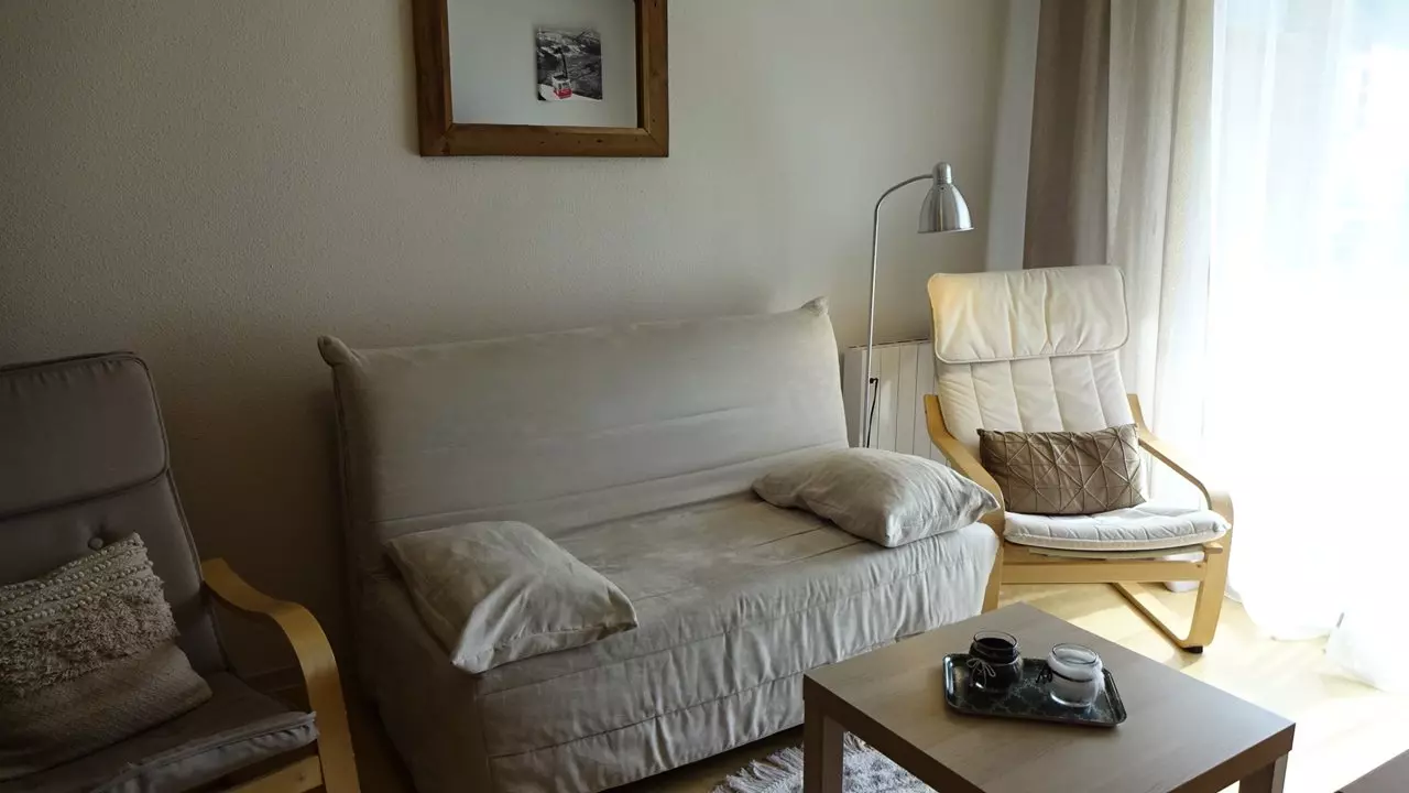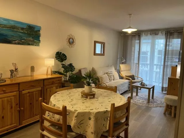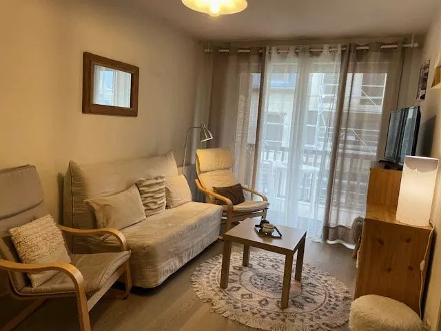 The main room, facing south, consists of a kitchen area equipped with a dishwasher, fridge, induction hob and a combined oven/microwave, a living room with a sofa bed and 2 armchairs, a television. Bay window opening onto a large balcony with garden furniture