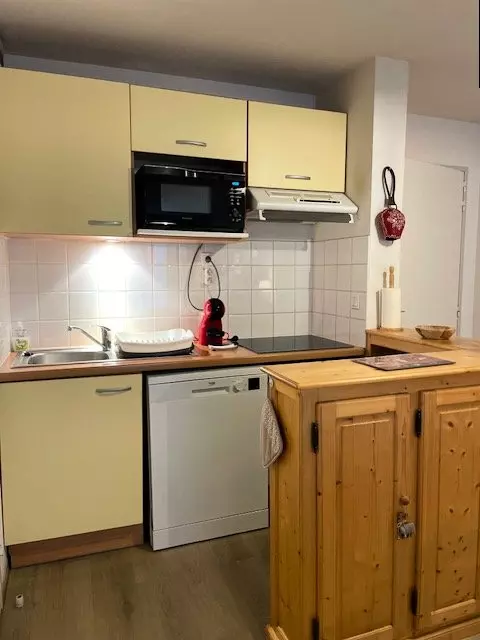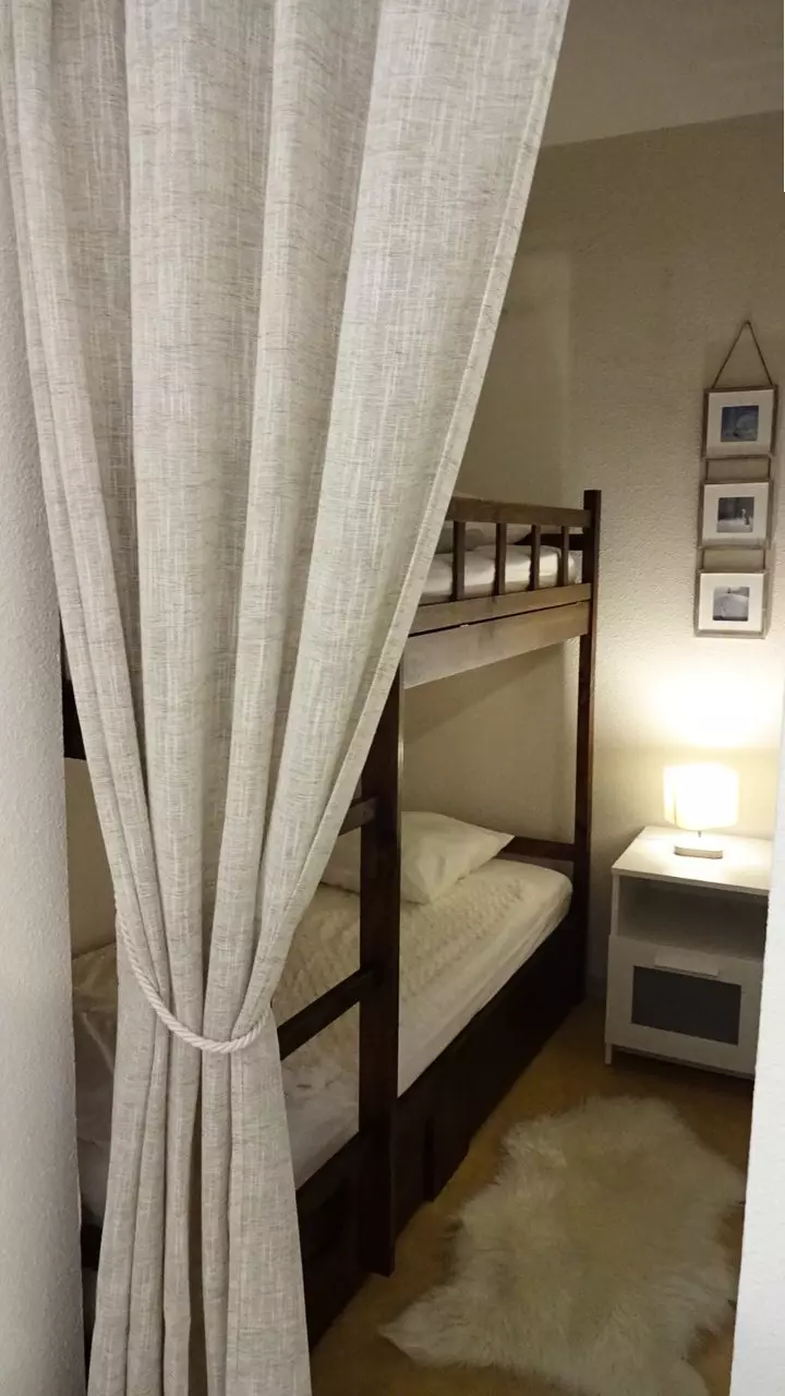 A bedroom with a 140 cm bed and a south-facing storage cupboard and a cabin with 2 bunk beds. A bathroom with a washing machine and a separate toilet. Parking space, a ski locker and a shared bicycle storage room. Apartment with a WIFI box. PETS PROHIBITED