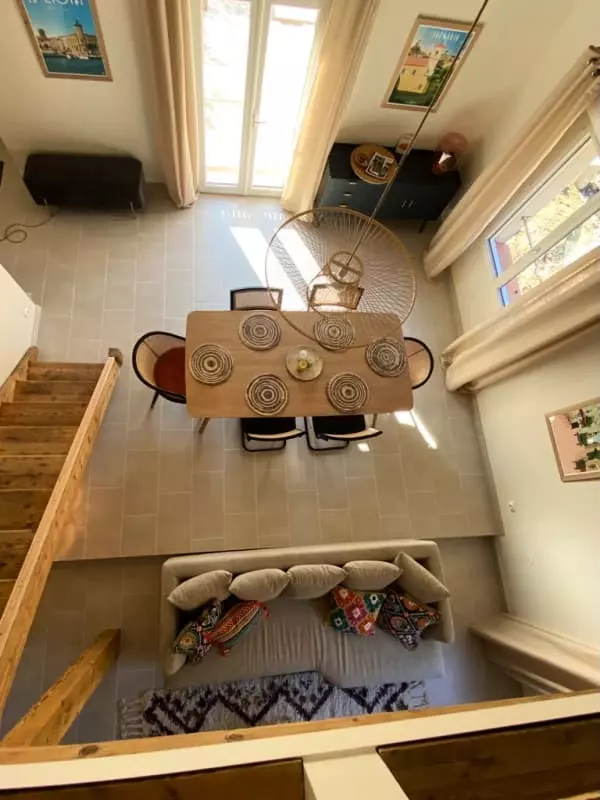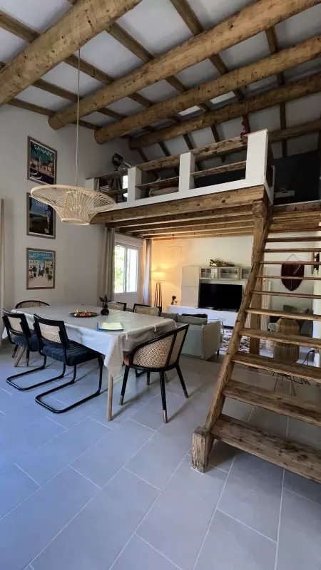 Renovated in 2022, the 110 m² house features a new, fully equipped kitchen, a spacious living room, and a dining room. High ceilings, exposed beams, and a mezzanine add character.