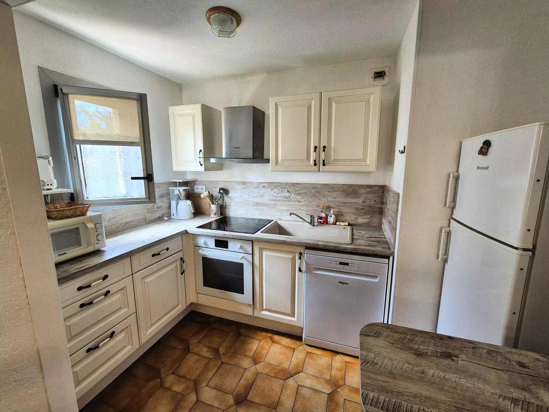 -Glass ceramic hob (3), extractor hood, oven, microwave, dishwasher, fridge and freezer, electric coffee maker, kettle, toaster.