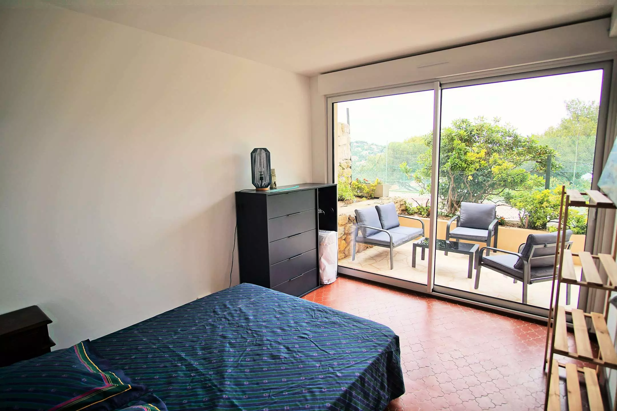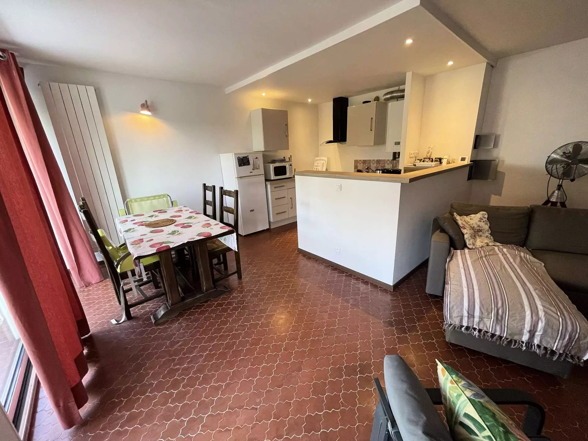 The living room, equipped with a convertible sofa, gives access to the terrace.
