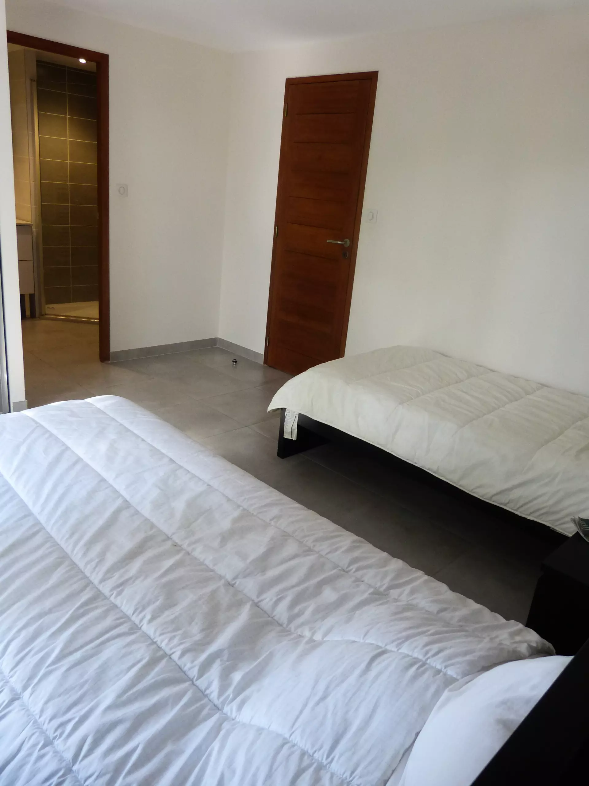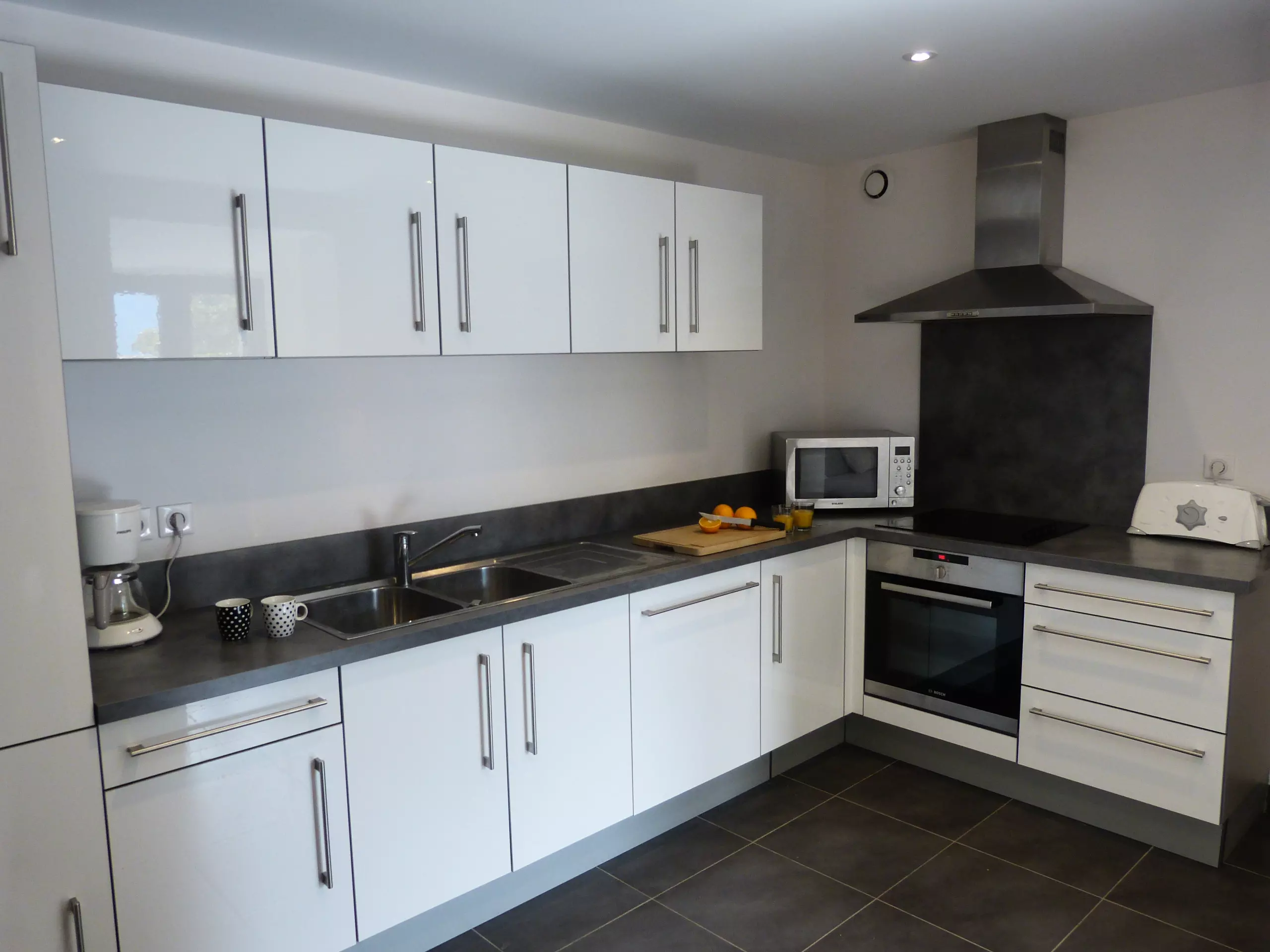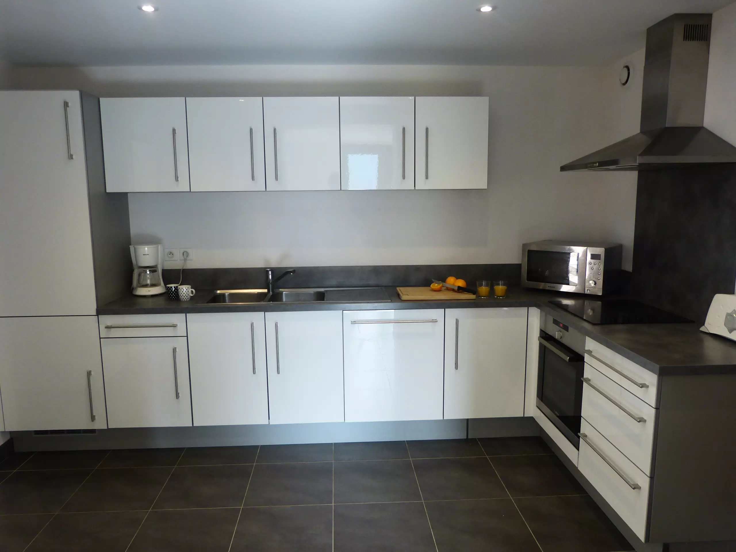 The accommodation features two welcoming bedrooms that can accommodate up to six people, with a flexible layout including a queen-size bed, a sofa bed, and two single beds. The fully equipped open-plan kitchen will delight cooking enthusiasts, with its many amenities such as an oven, a dishwasher, and a coffee machine.