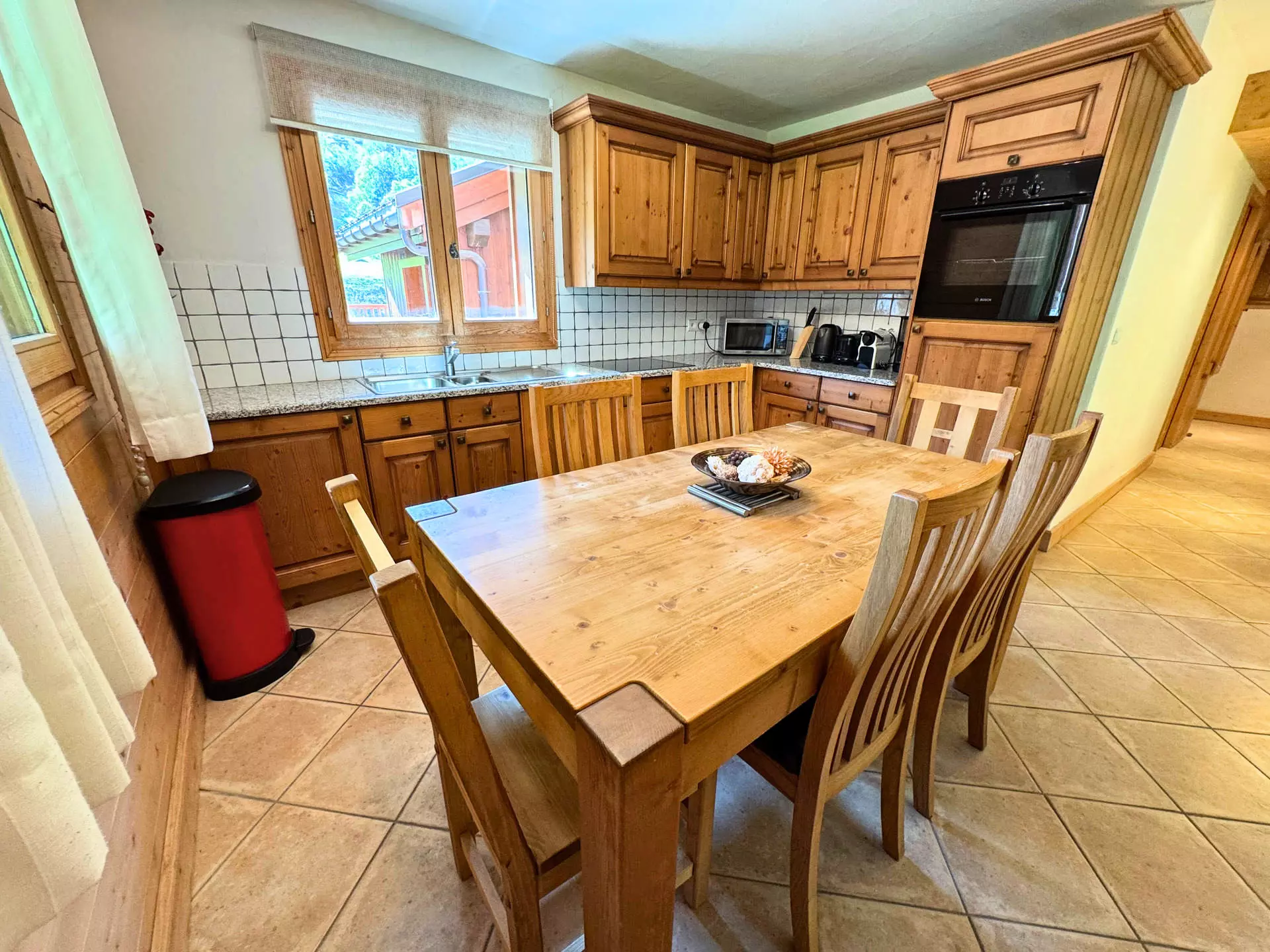 Fitted kitchen open to living room: ceramic hob, extractor hood, oven, microwave, fridge with freezer, dishwasher, coffee maker, kettle, toaster, raclette machine