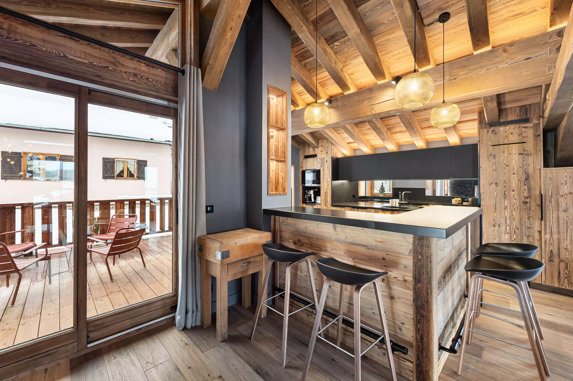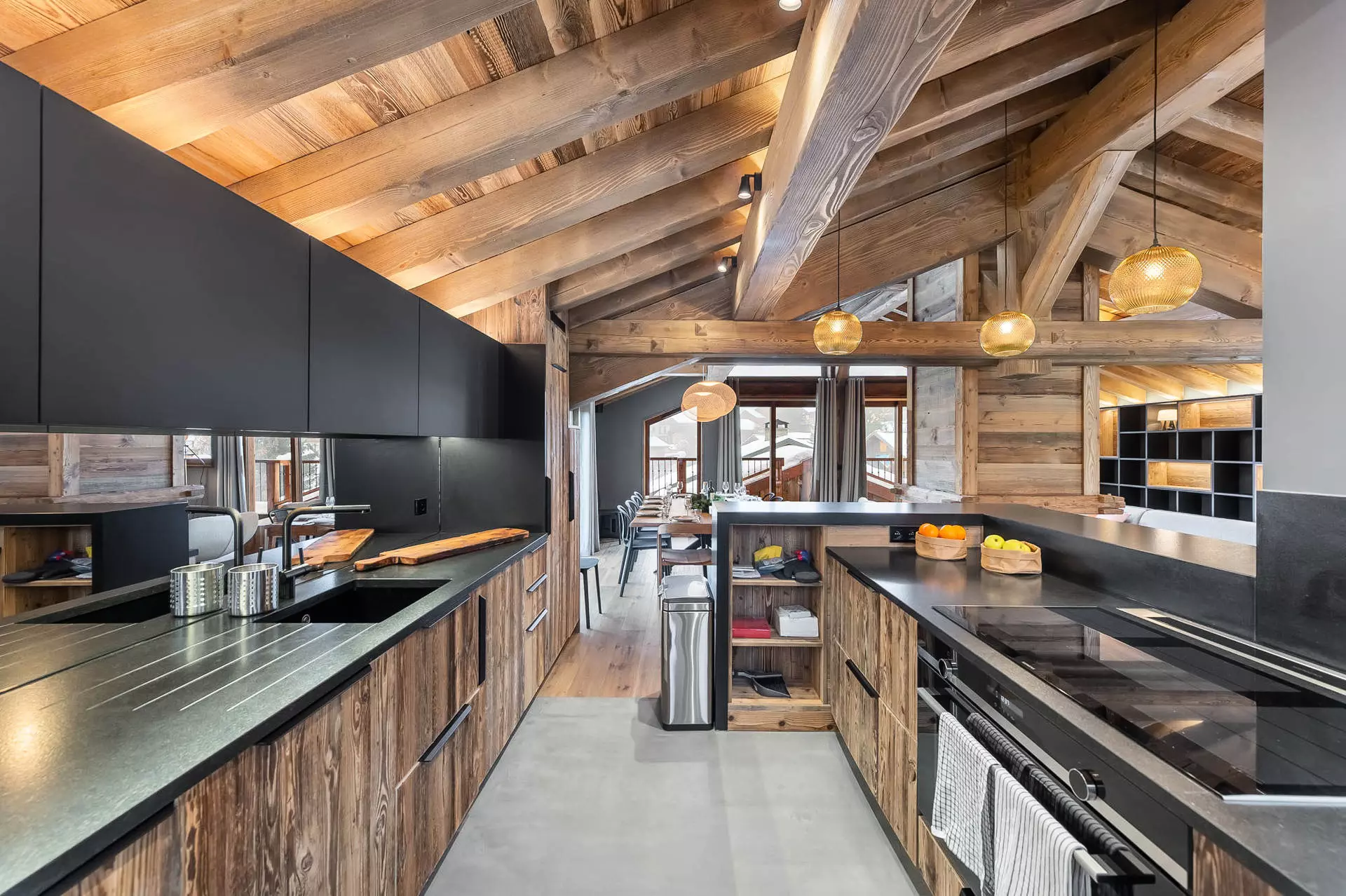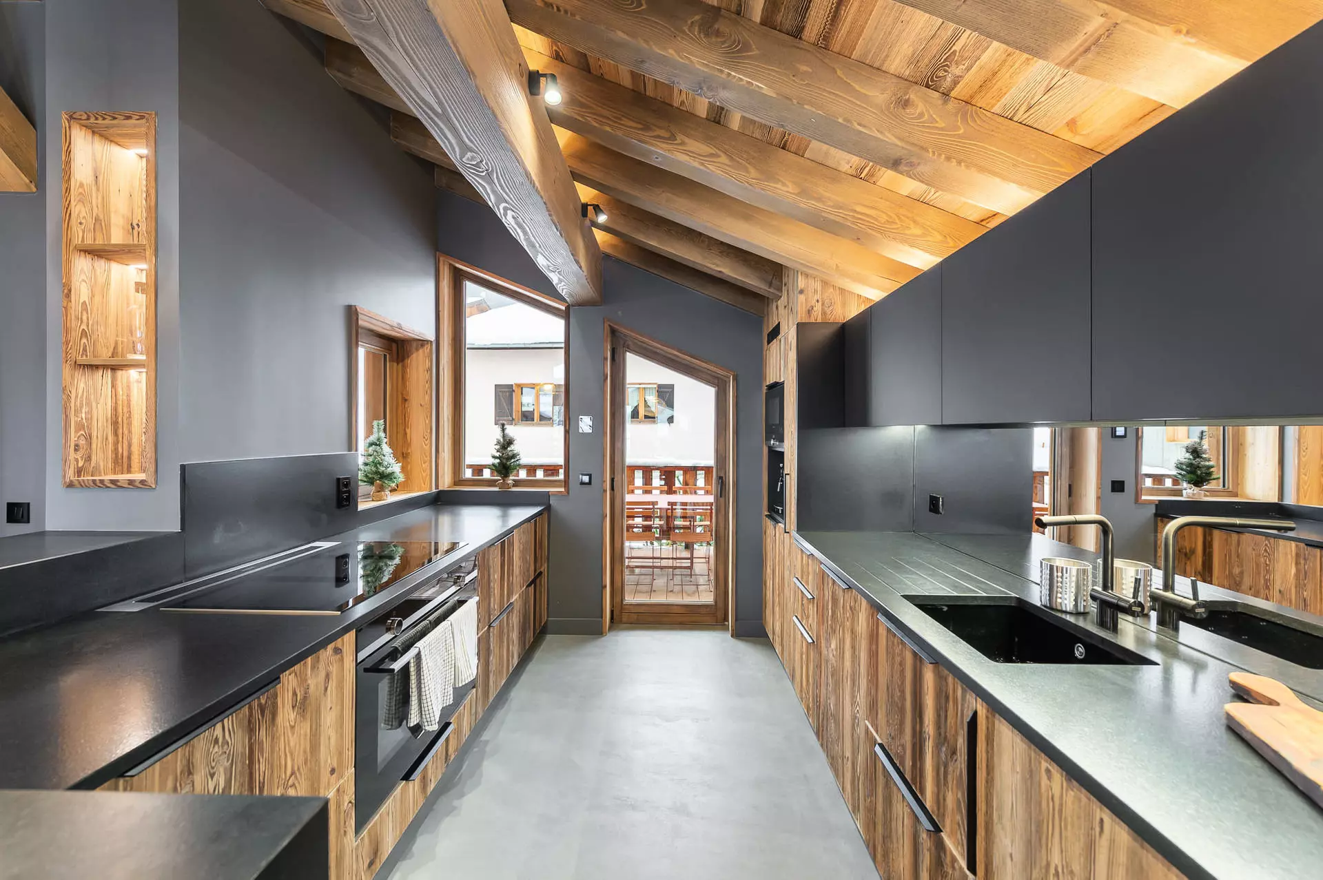 Kitchen open to the spacious living room: 4 induction hobs, microwave, oven, integrated extractor hood, refrigerator, dishwasher, coffee maker, kettle, toaster, mountain and village view