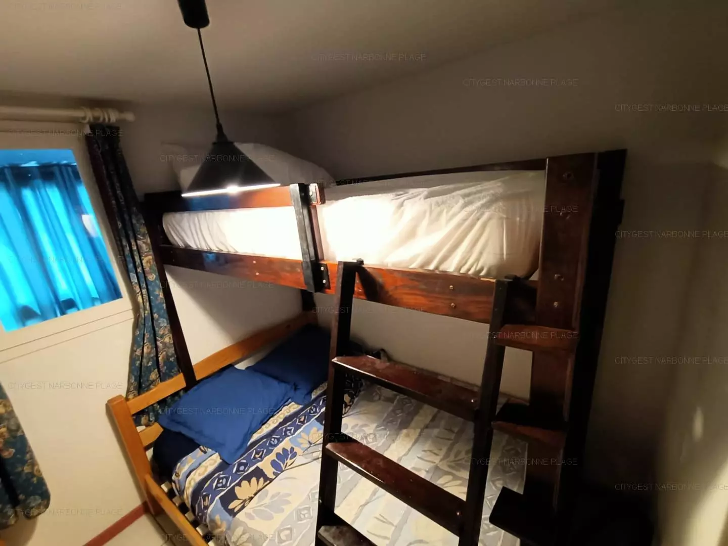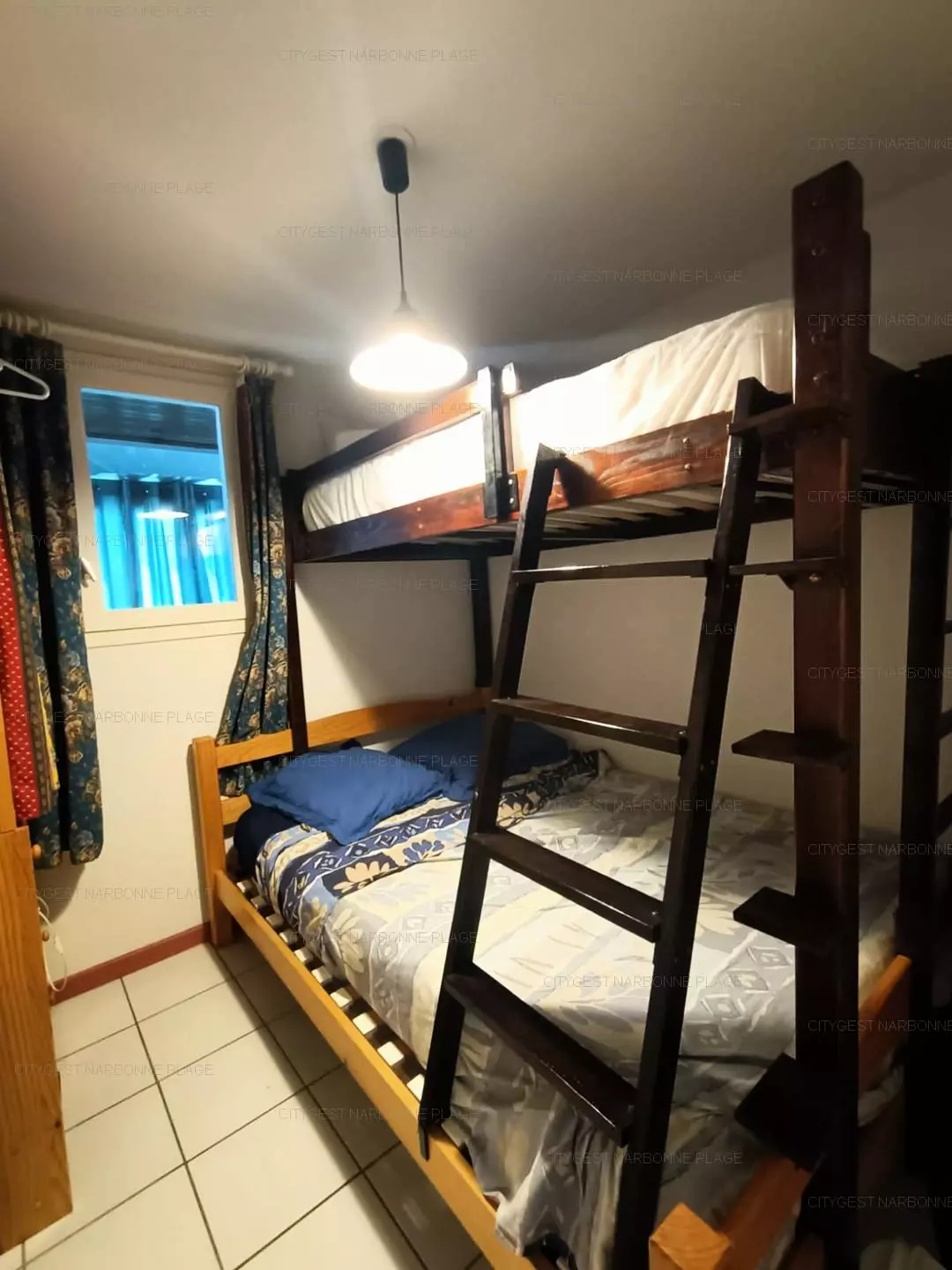 One bedroom with a 140cm double bed and storage cupboard, another bedroom with a 140cm double bed and a 90cm single mezzanine bed.