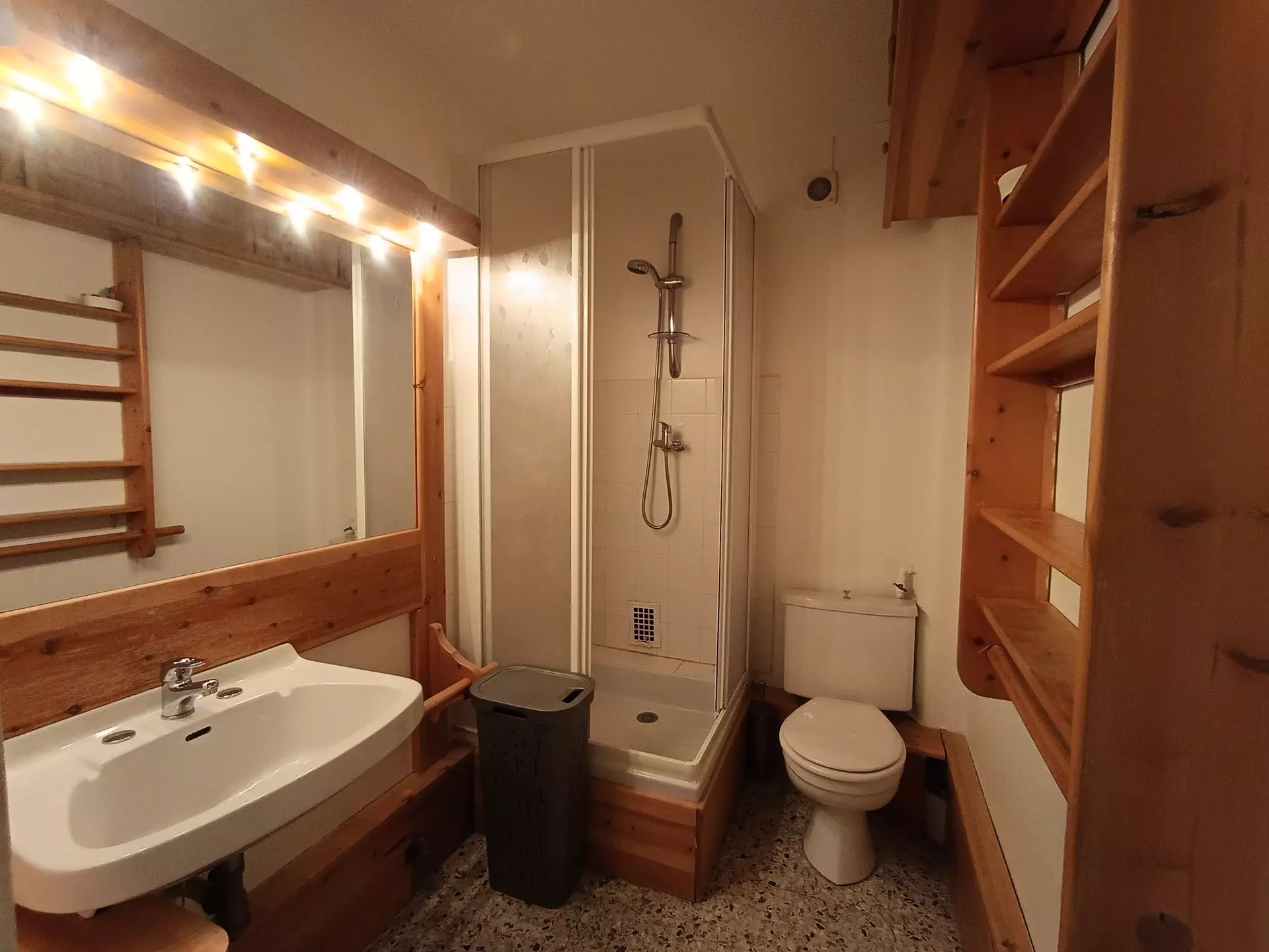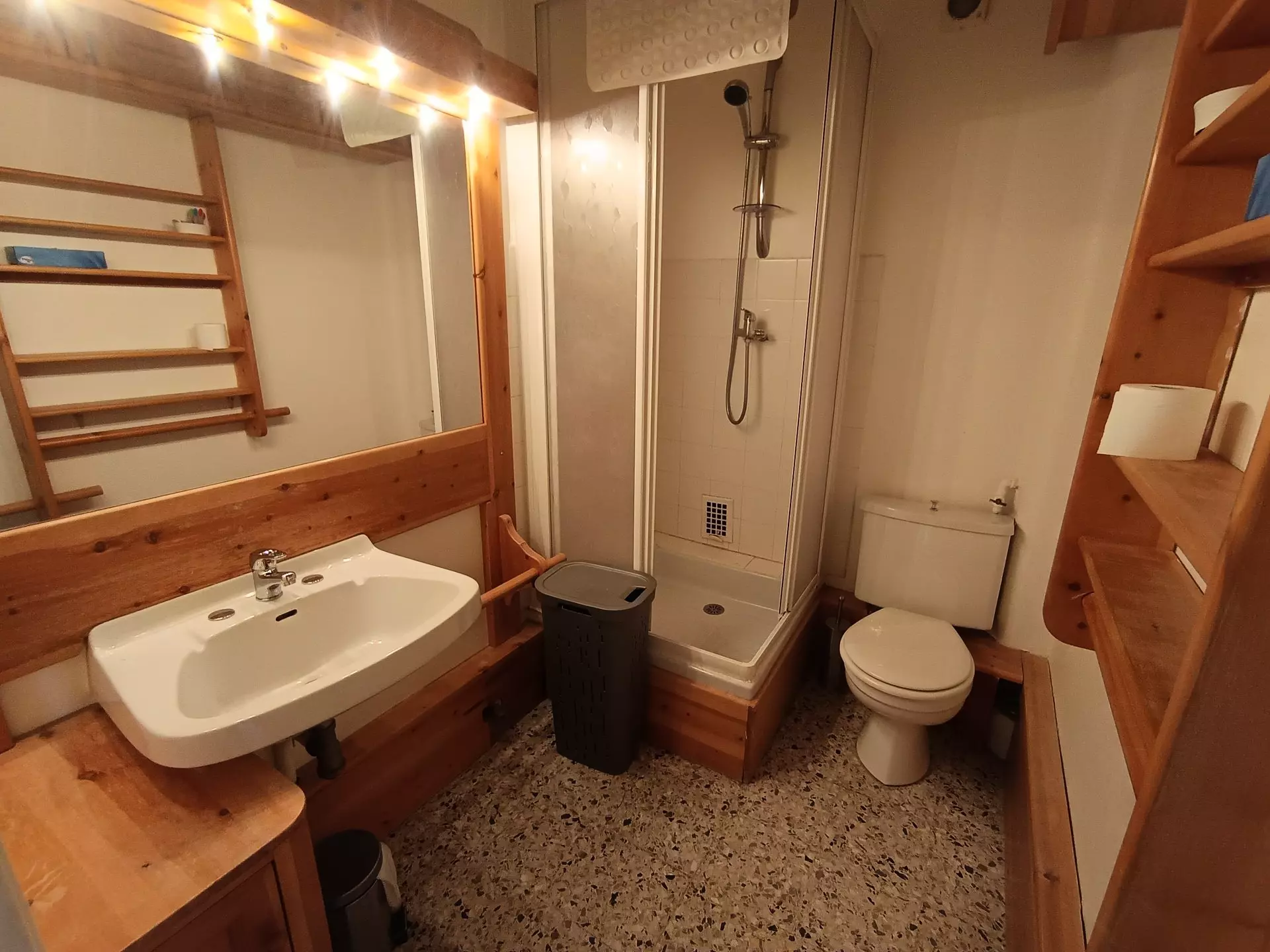 Shower room: Shower cubicle, toilet, sink, large mirror, towel rack, hairdryer.