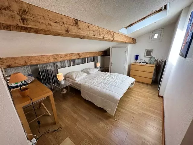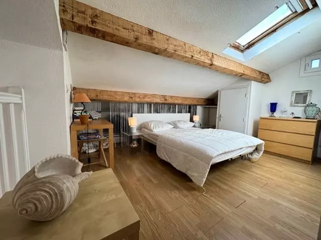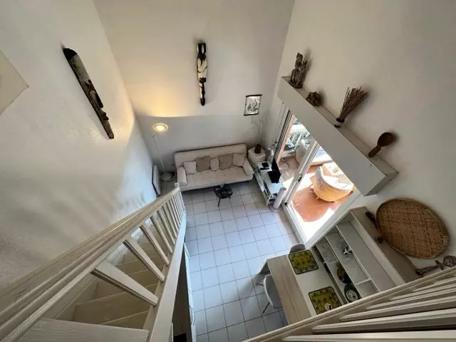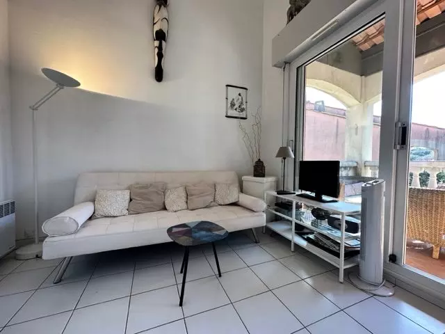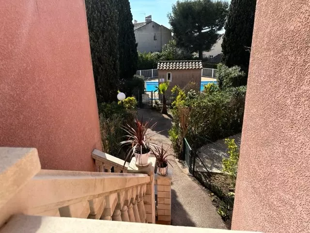 Small private residence with its swimming pool (free), pedestrian access to the port and the beach, beautiful duplex apartment of approximately 45 m², furnished balcony of 10 m², unobstructed view of the gardens, quiet, 1 bedroom and 1 mezzanine bedroom, kitchen open to bright living room, bathroom (bath + WC included).