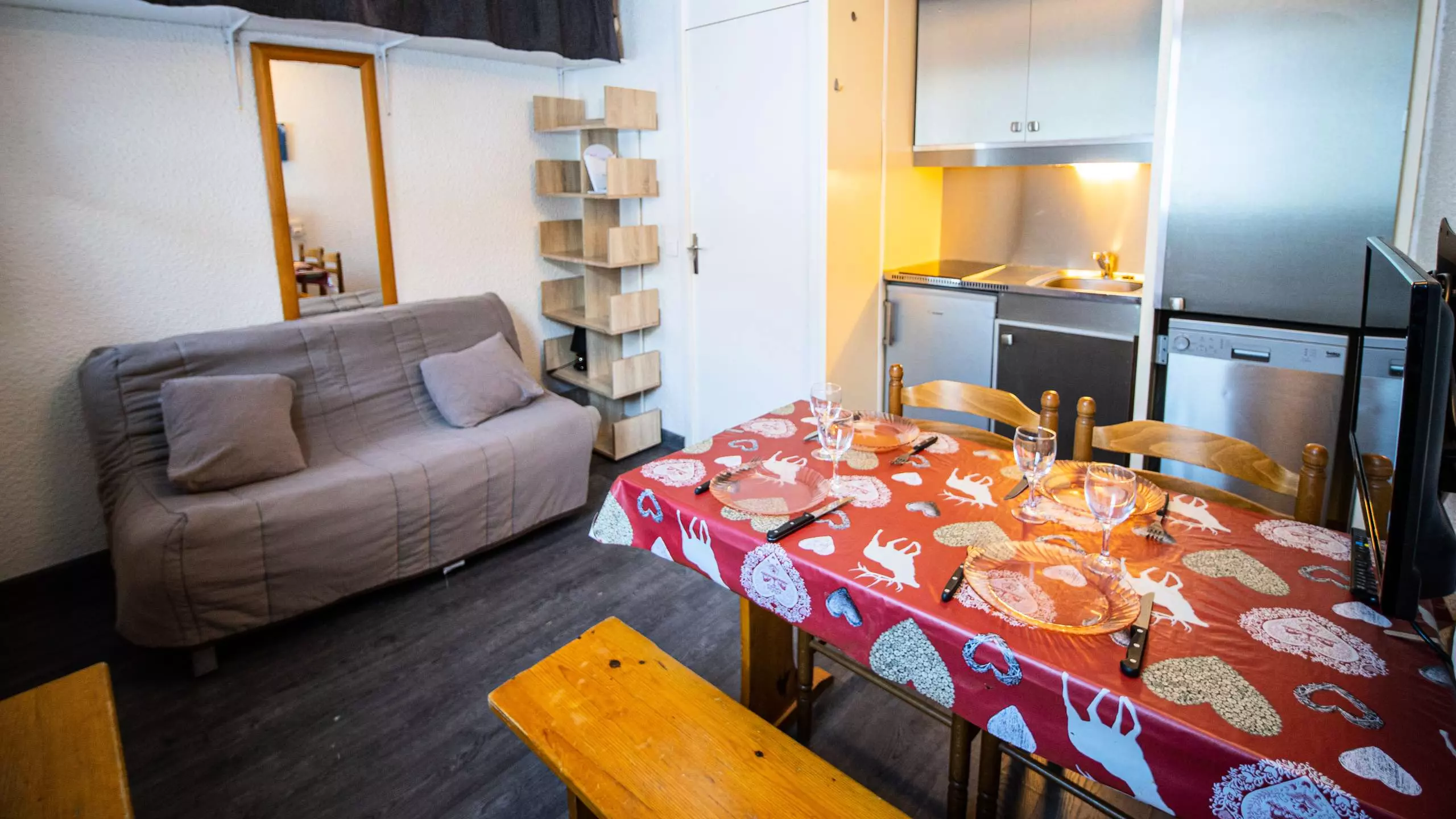 - Living room equipped with a sofa bed (main bed in the apartment) and a television.