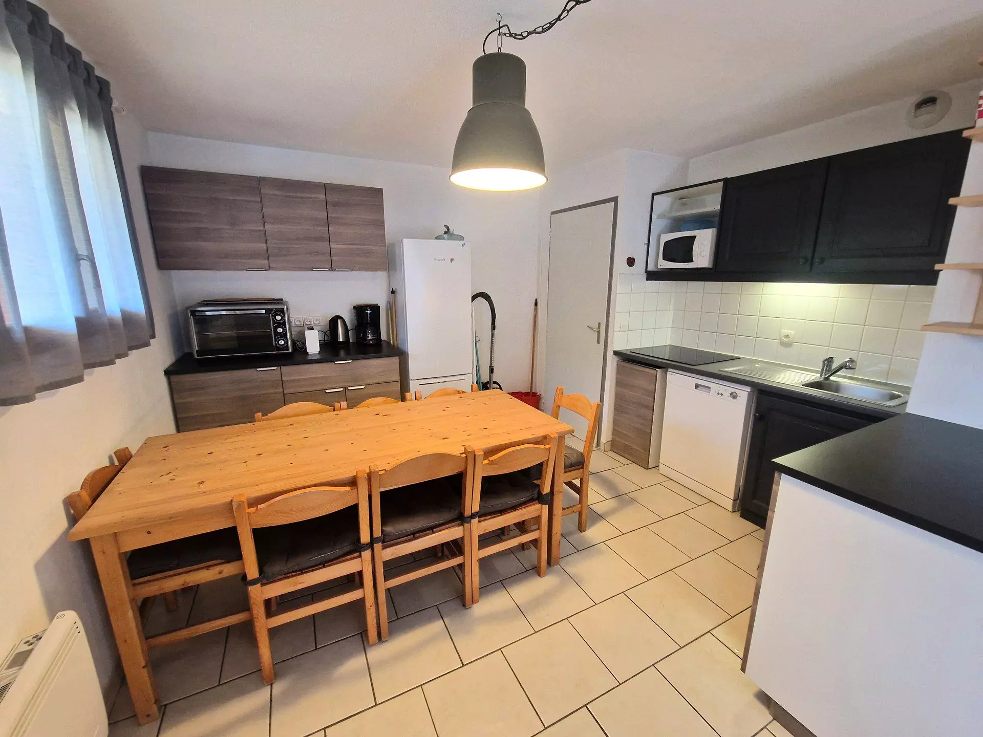 - Kitchen area with hotplates, large refrigerator, dishwasher, microwave, mini oven.