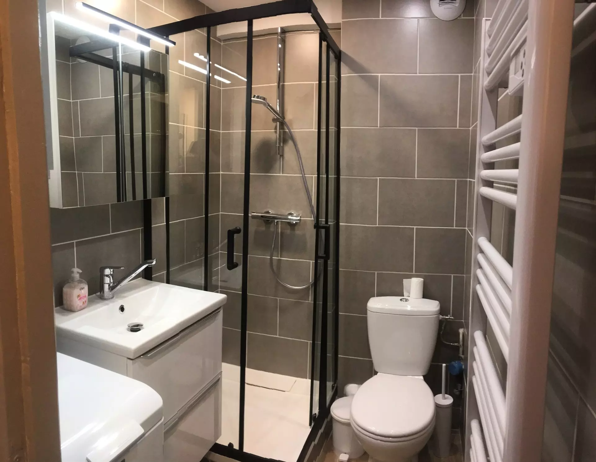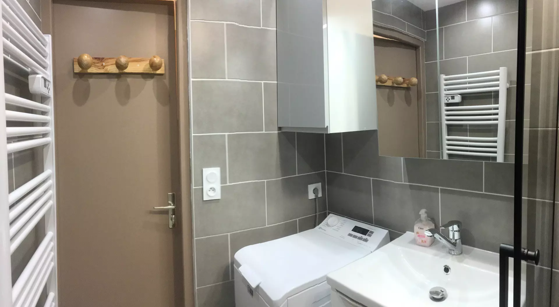 Shower room: sink, shower, washing machine, hair dryer and WC.