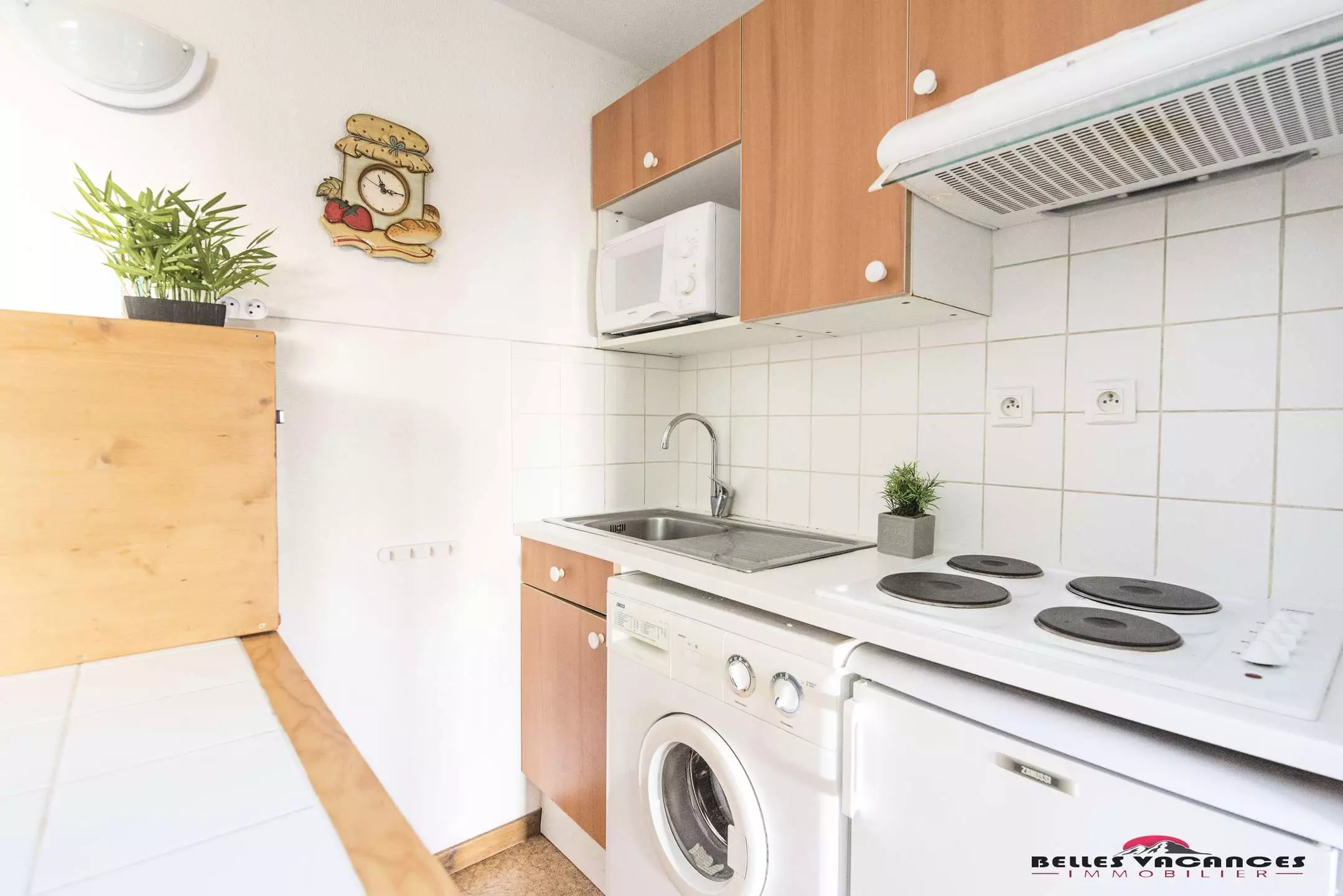 A fully equipped kitchenette opening onto the living room (4-burner electric hob, electric oven + microwave + washing machine)