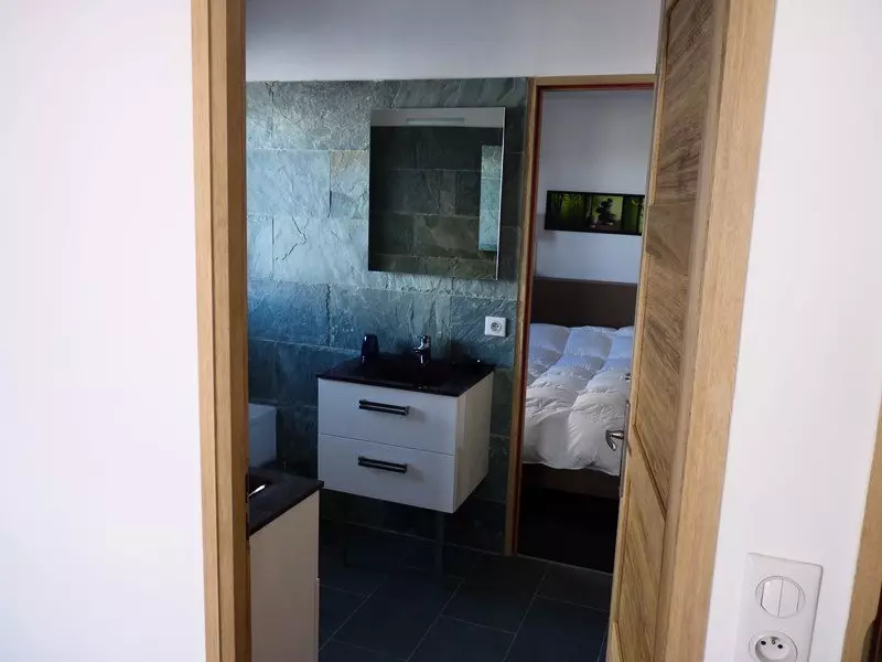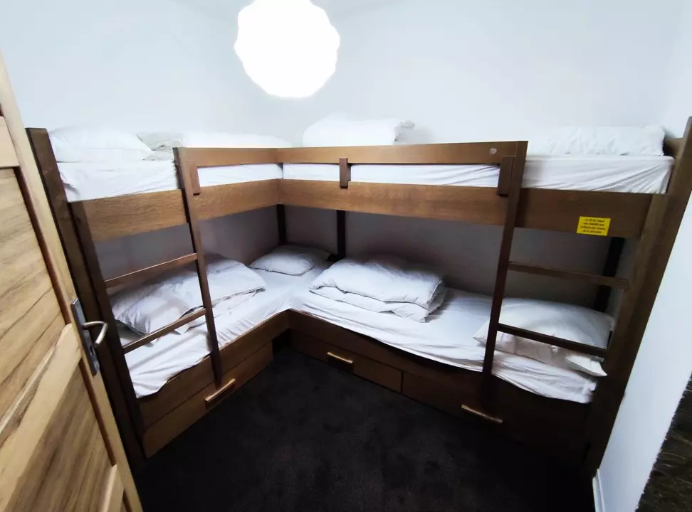 Apartment composed of a living room with table and chair for 8 people, a sofa, television; an American kitchen with traditional oven, microwave, 4-burner hob, refrigerator with 3-drawer freezer section; 2 bedrooms with a large bed 160 x 200cm (one with access to a south-facing balcony and the other with direct access to the bathroom); a bathroom with bathtub; a blind bedroom closed by a door with 2x2 bunk beds (reserved for children, not suitable for adults) in L (direct access to the shower room); a shower room; a WC located at the entrance of the apartment.