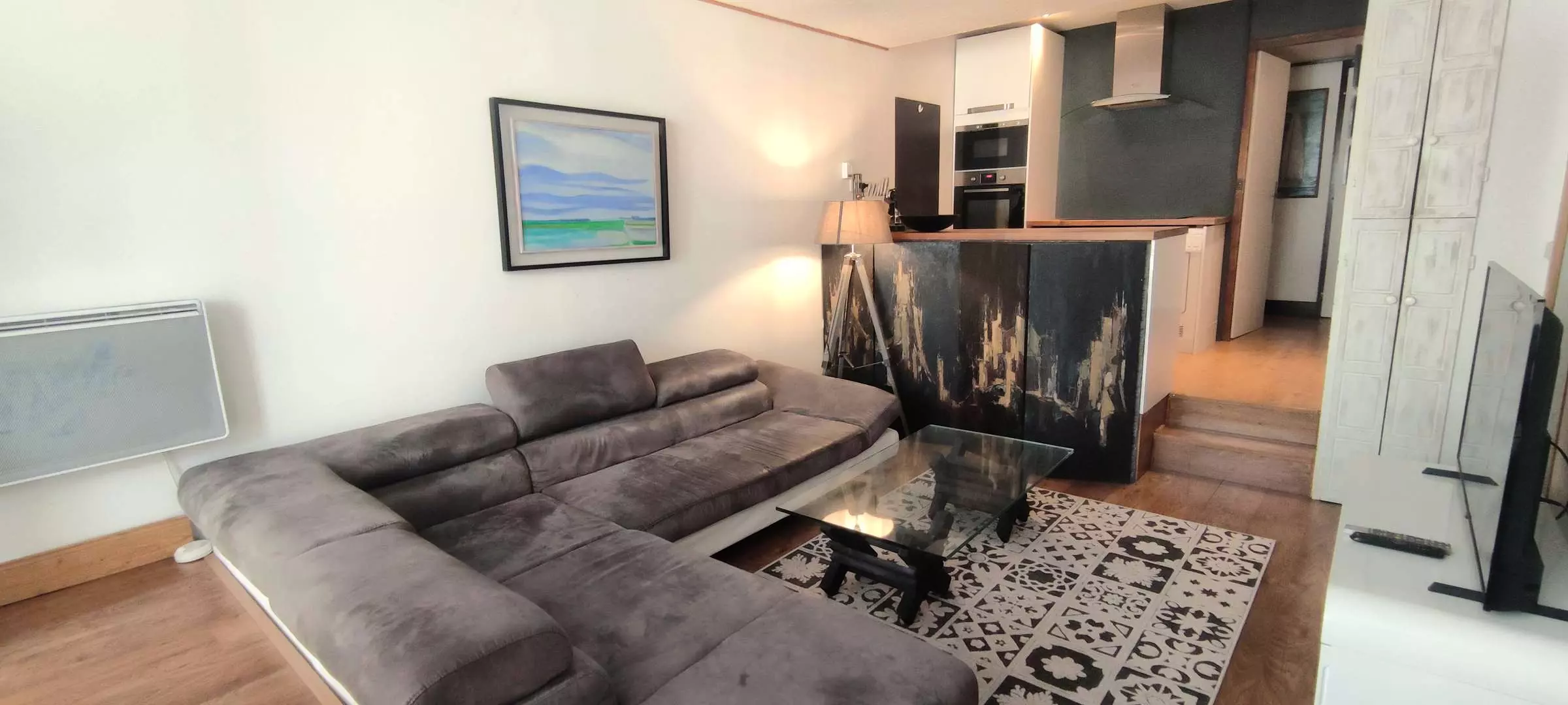 Living room with a relaxation area, television, bedroom 1 with 140 cm bed overlooking the exterior, bedroom 2 with children's bunk beds (reserved for children, not suitable for adults) + 1 pull-out bed, dining area near the bay windows and view of the Belvédère ski slope, large American kitchen, bathroom, separate toilet, small office space, parquet flooring. Pets not allowed. Internet included.