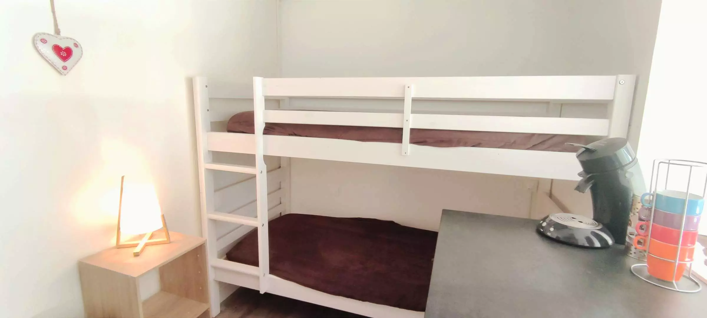 1 sofa bed (140 cm) and 2 bunk beds (reserved for children, not suitable for adults), bathroom, balcony on the 1st floor. NO SMOKING. No internet.