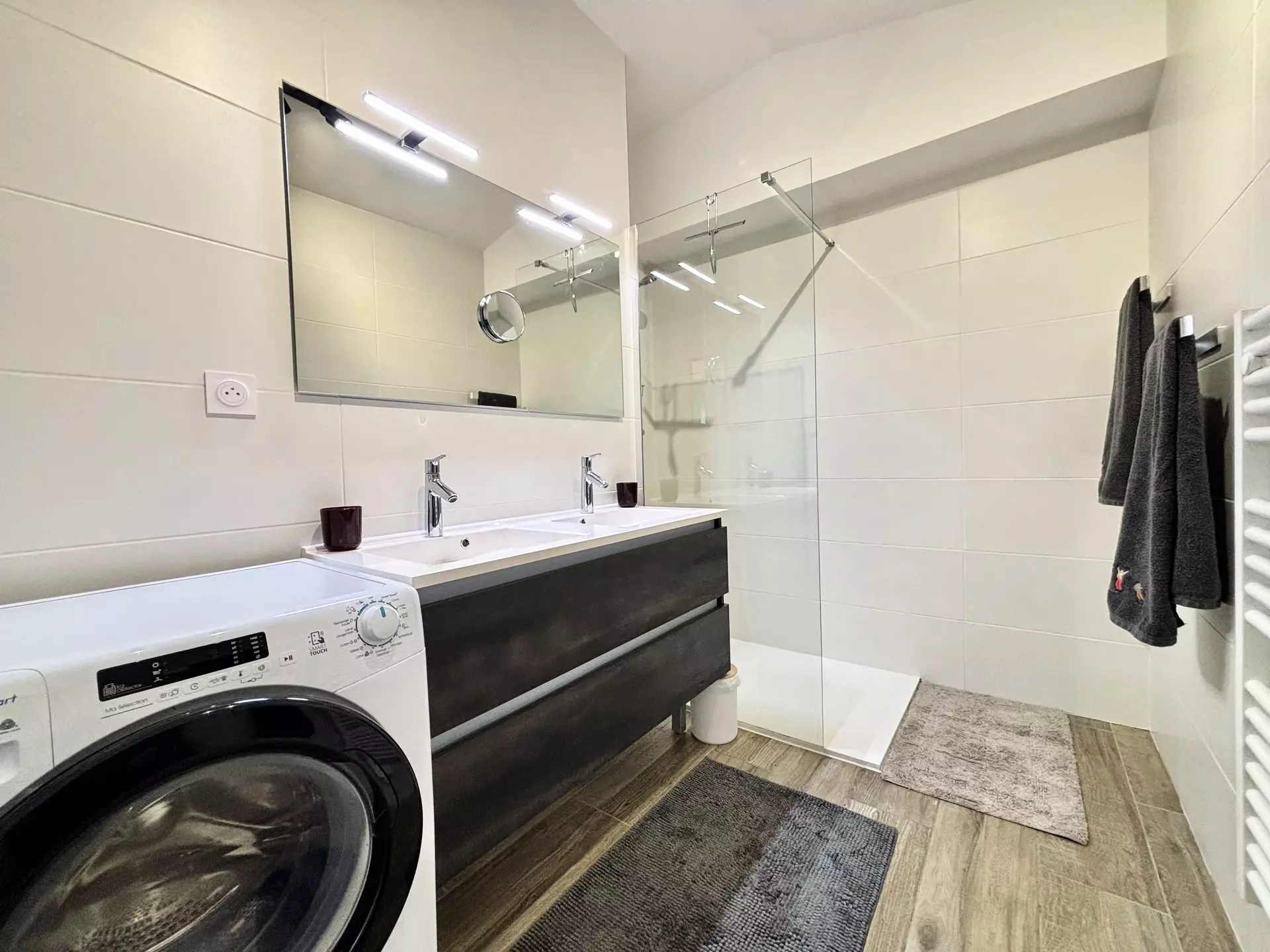 - A fully equipped kitchen open to the living room (large refrigerator with freezer compartment, oven, 3-burner induction hob, dishwasher, microwave and extractor fan)