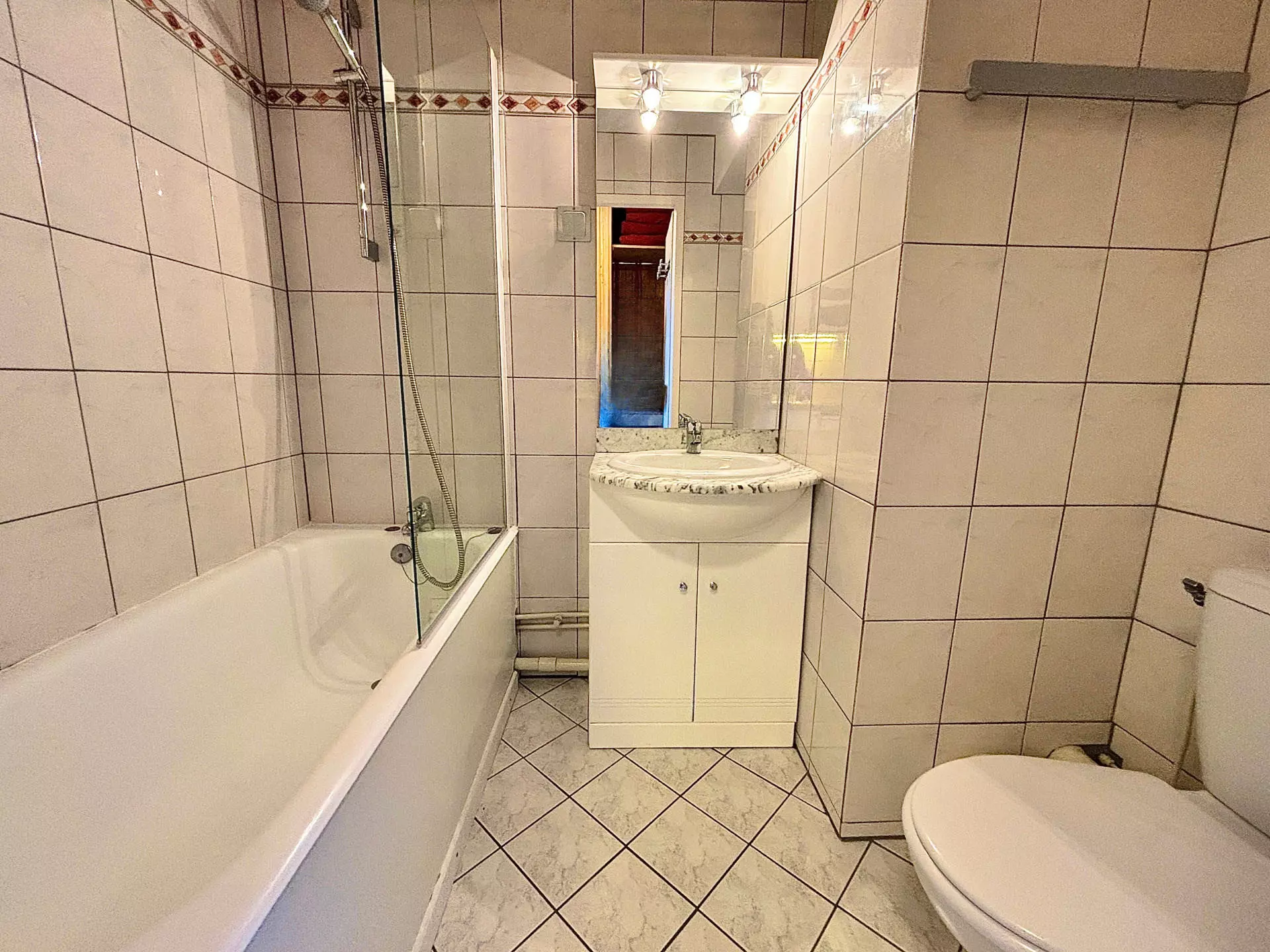 Bathroom: bathtub, shower screen, hair dryer, toilet