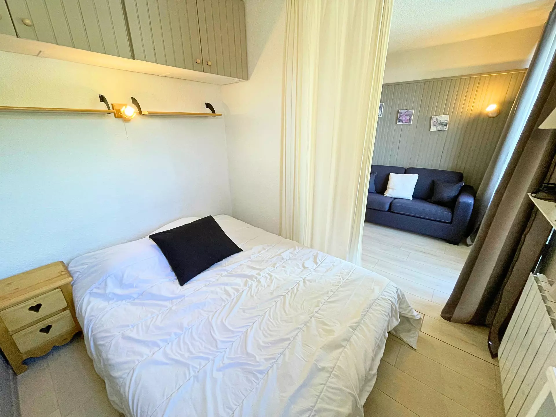 Living room: sofa, television, bedroom area separated from the living room by a curtain with 1 BZ sofa (140cm)