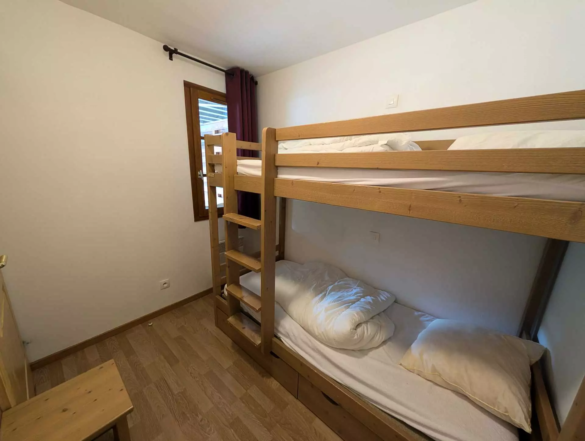 Mountain corner of the living room through a door: 2 single bunk beds (80x190), window overlooking the terrace, storage drawers, coat rack.