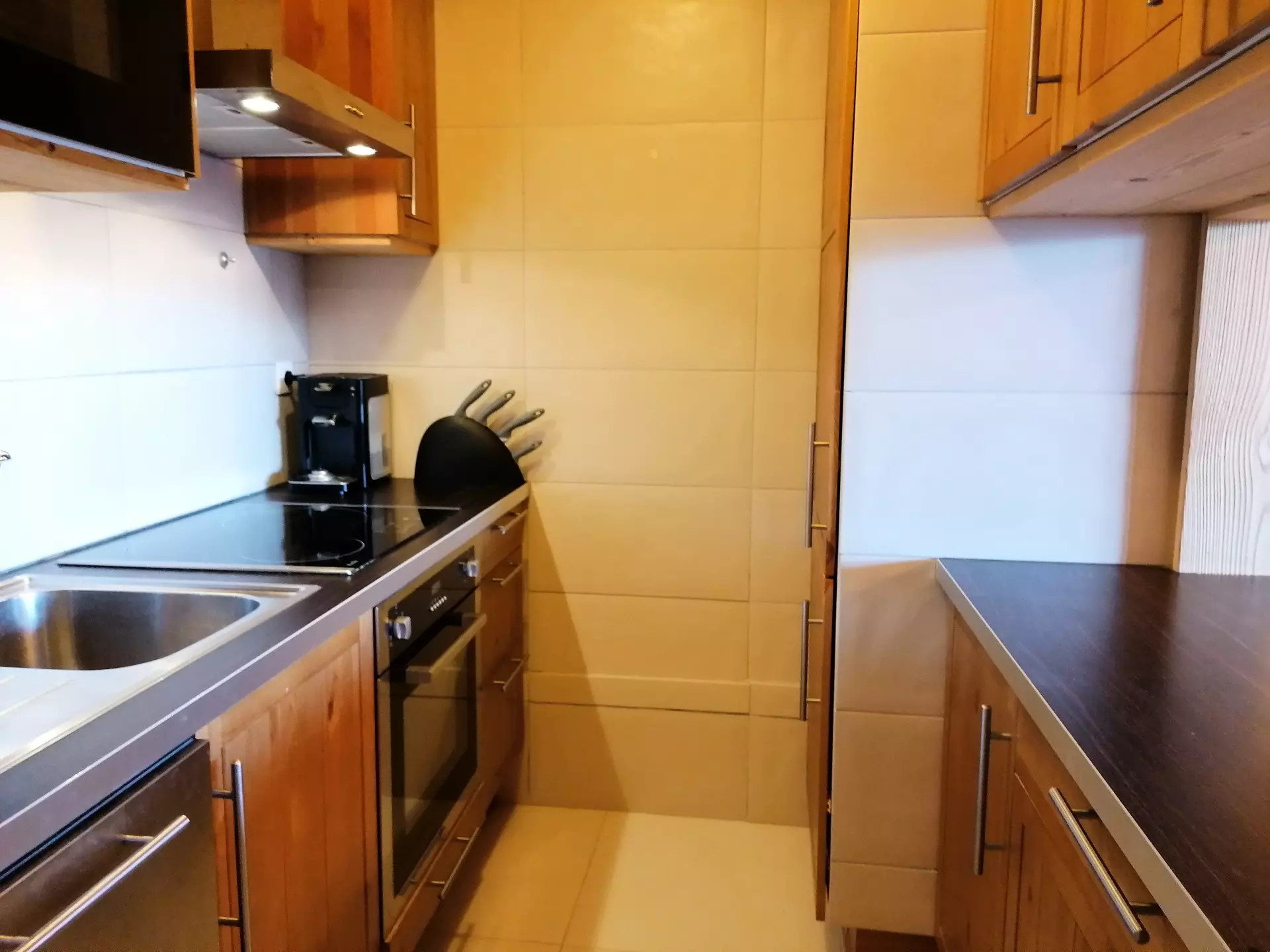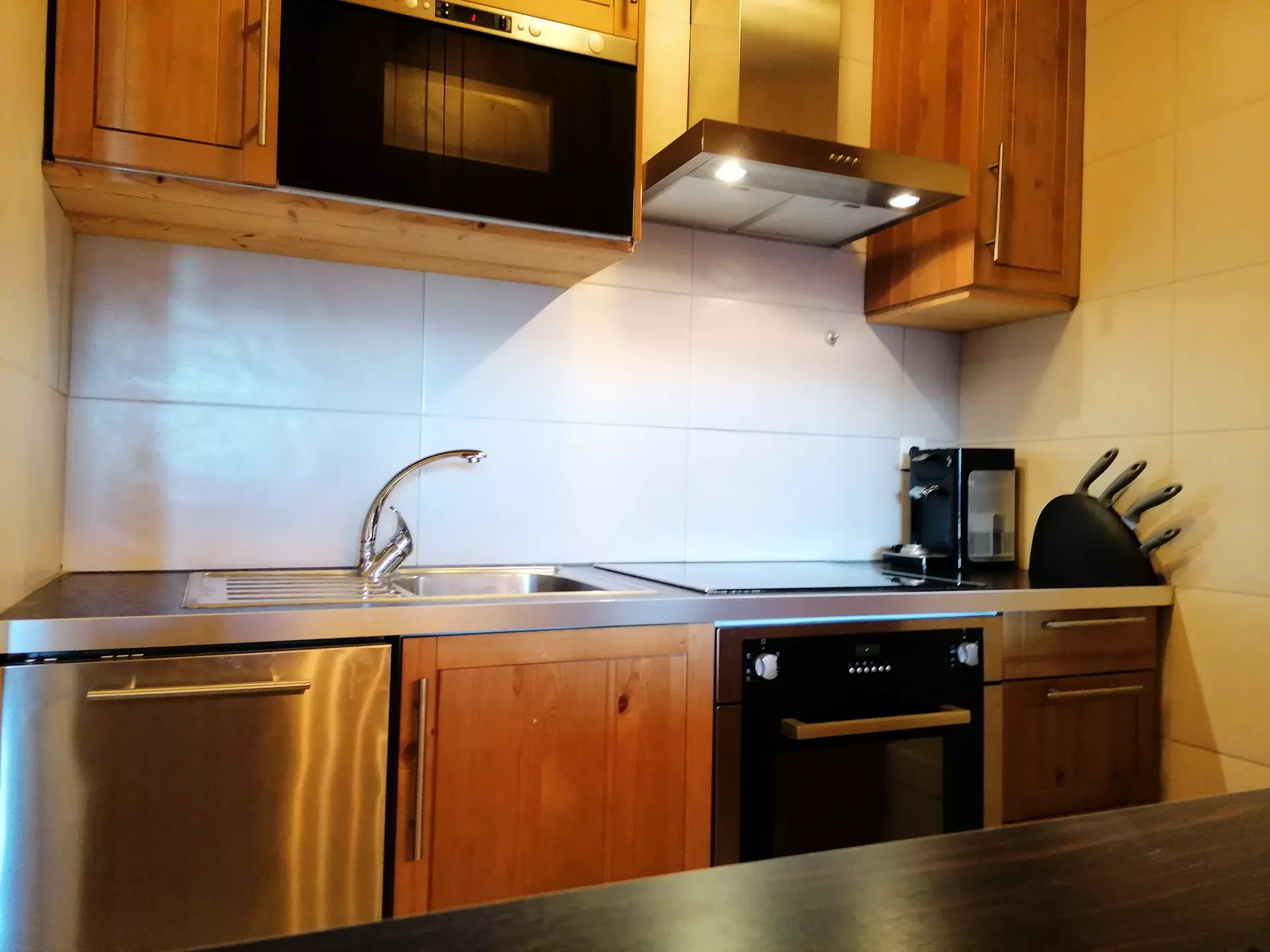 * Kitchen with serving hatch: ceramic hob, oven, microwave, dishwasher, fridge-freezer, extractor fan, raclette machine, Senseo coffee maker, kettle, toaster;