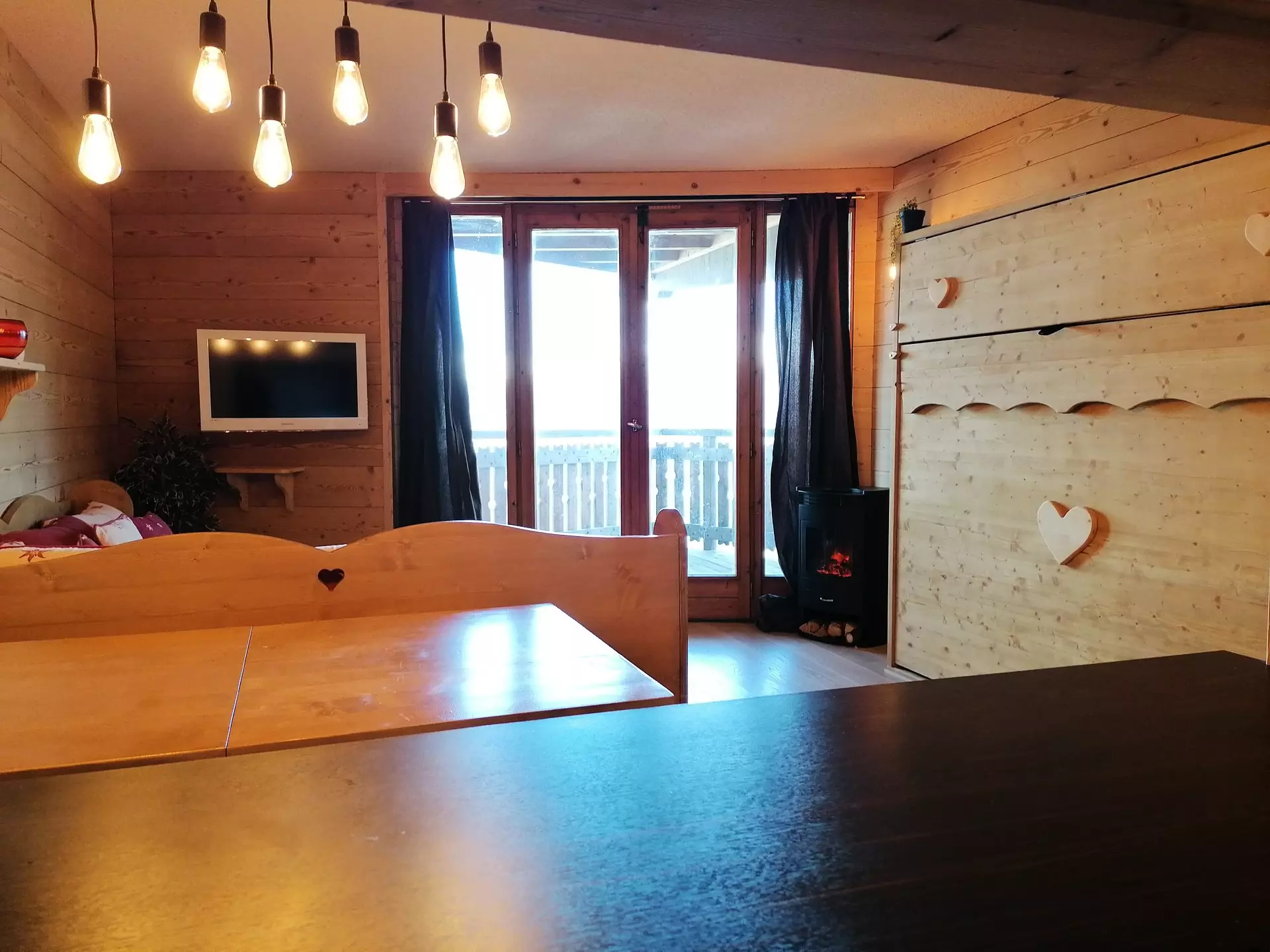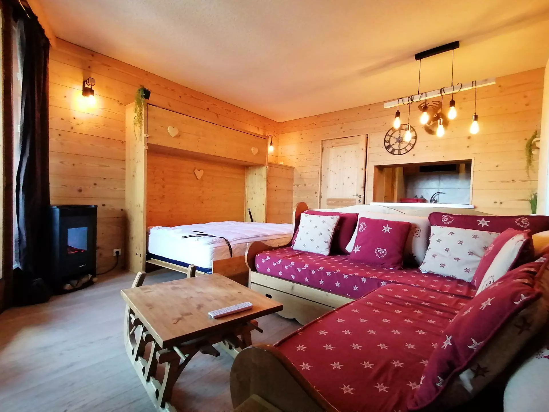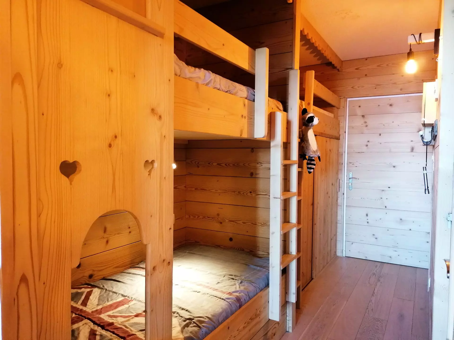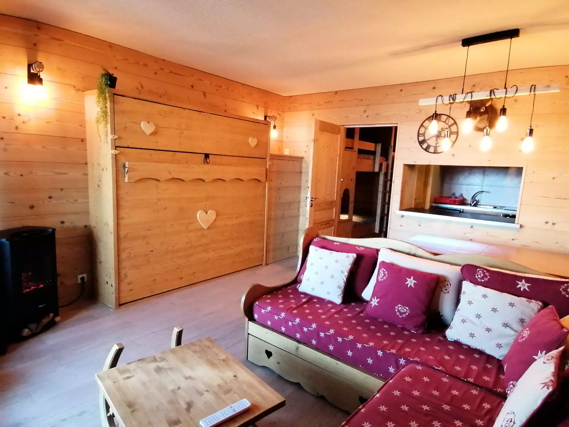 COMMENTS: Magnificent and spacious studio, completely renovated in wood, mountain style, niches for bunk beds, storage and custom-made fold-down bed. Located near the slopes and the shopping mall with a superb view of the valley and the mountains from its large balcony. Individual ski locker.