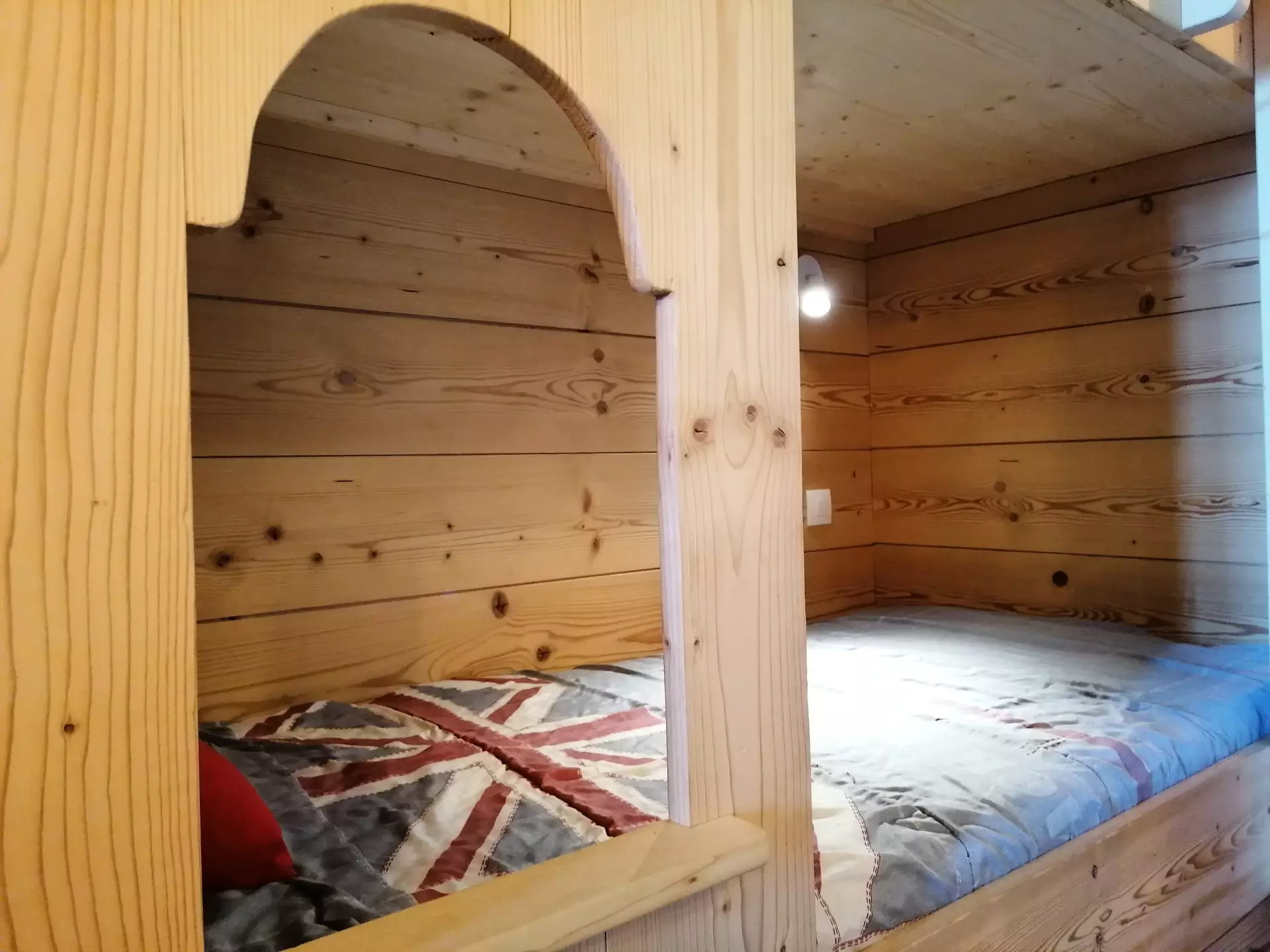 * Entrance / mountain corner: 2 bunk beds, 1 mezzanine bed, storage;