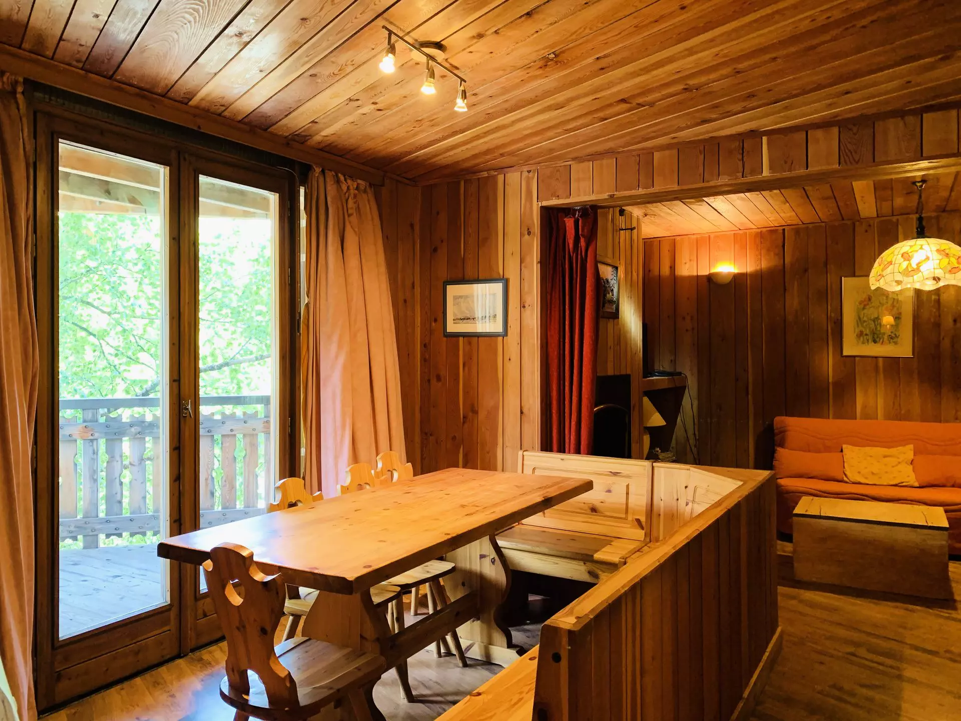 * Living room: dining room, large table with wooden corner bench, wooden chest of drawers, balcony access;