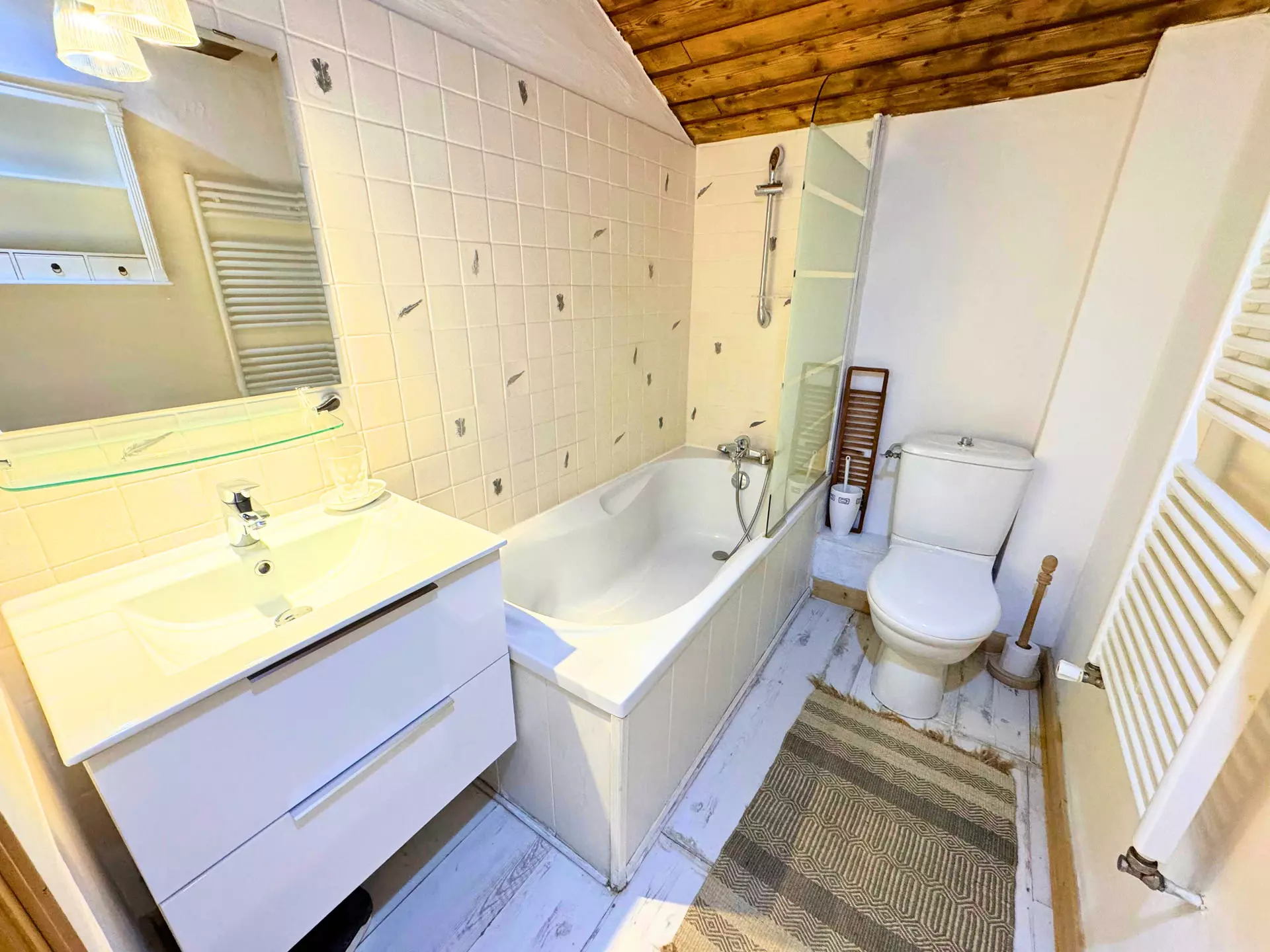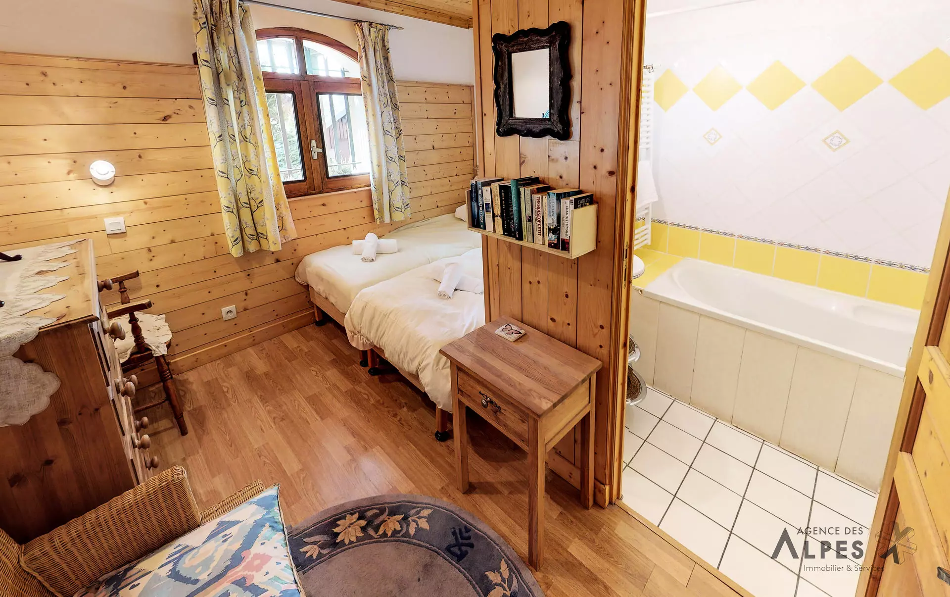 "Bouquetin" room: twin single beds (2x90 cm), chest of drawers, adjoining bathroom (sink, bathtub, toilet, towel dryer),